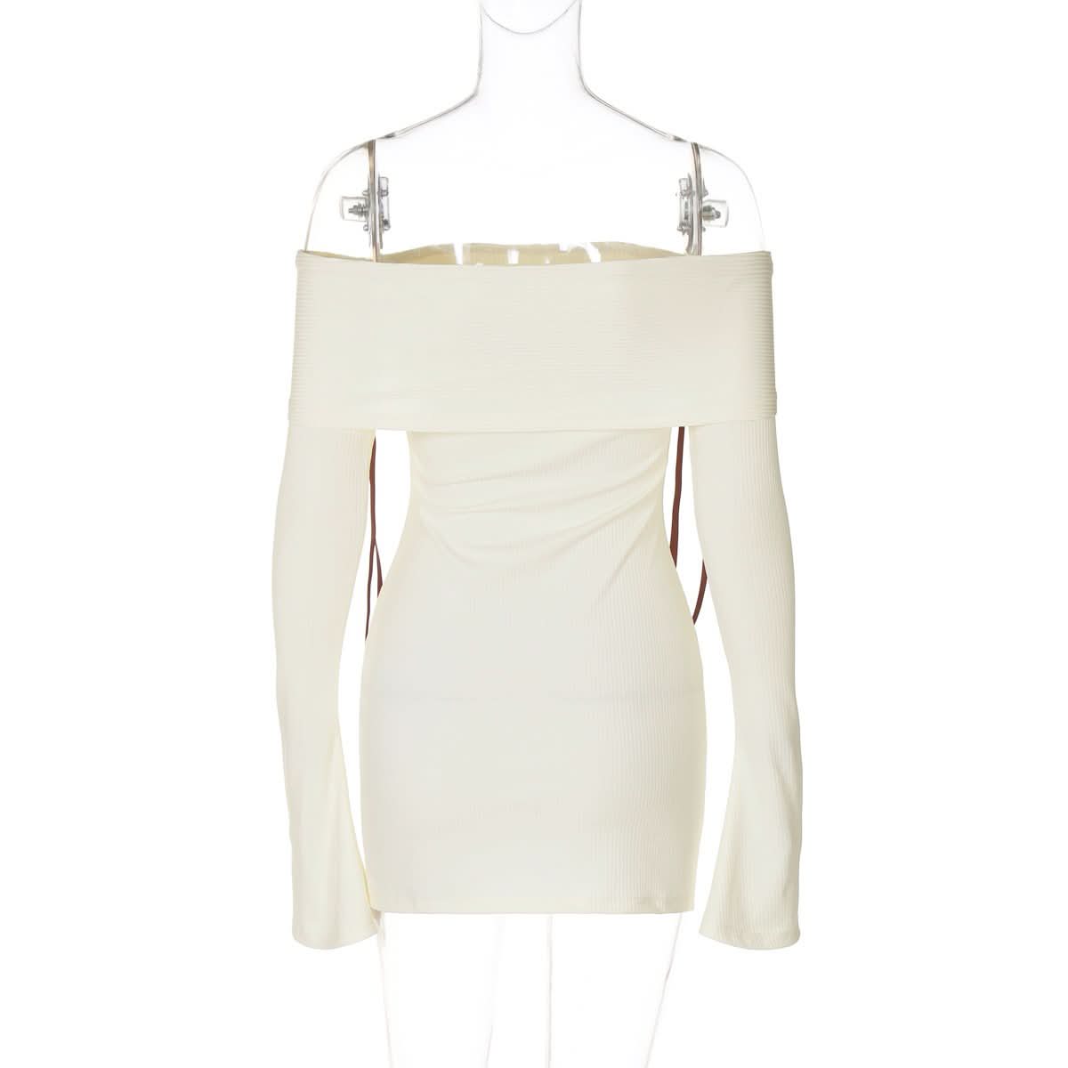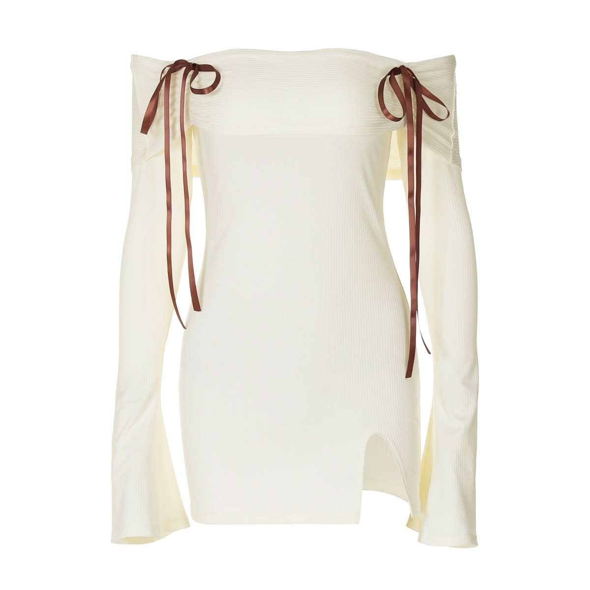 Off shoulder long flared sleeve bowknot ribbed mini dress