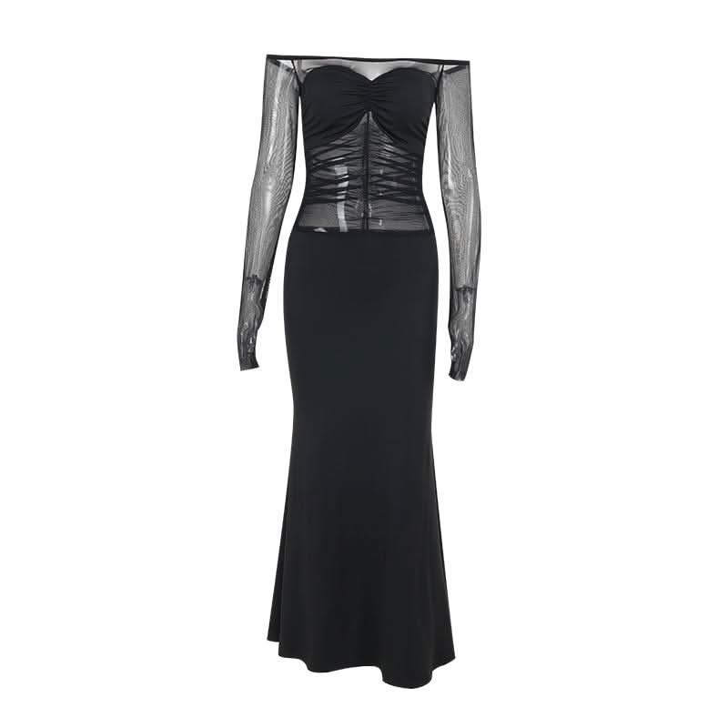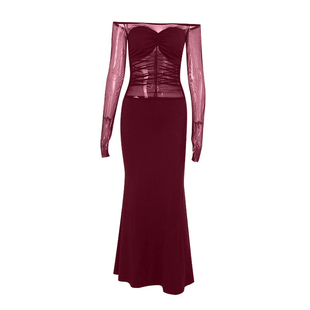 Off shoulder long sleeve mesh patchwork ruched maxi dress
