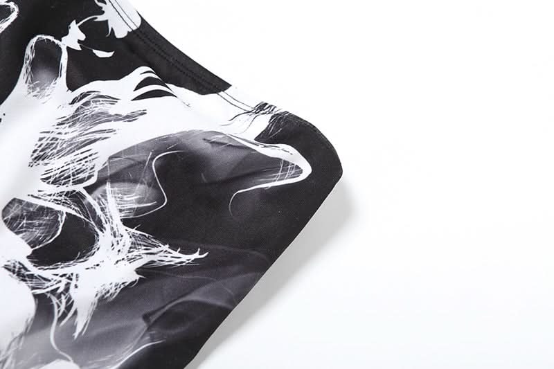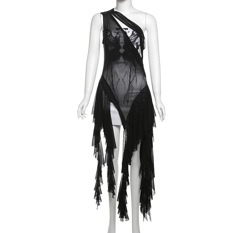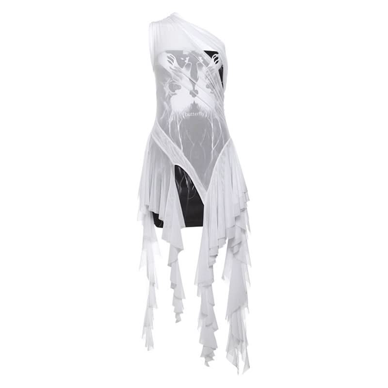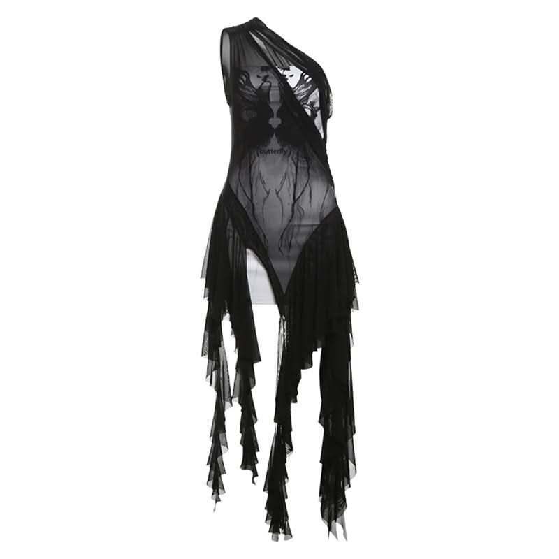 One shoulder mesh patchwork ruffle abstract 2 piece mini dress