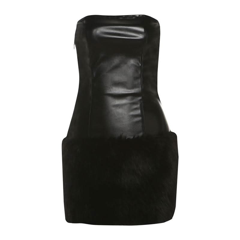 PU leather fluffy zip-up backless tube mini dress