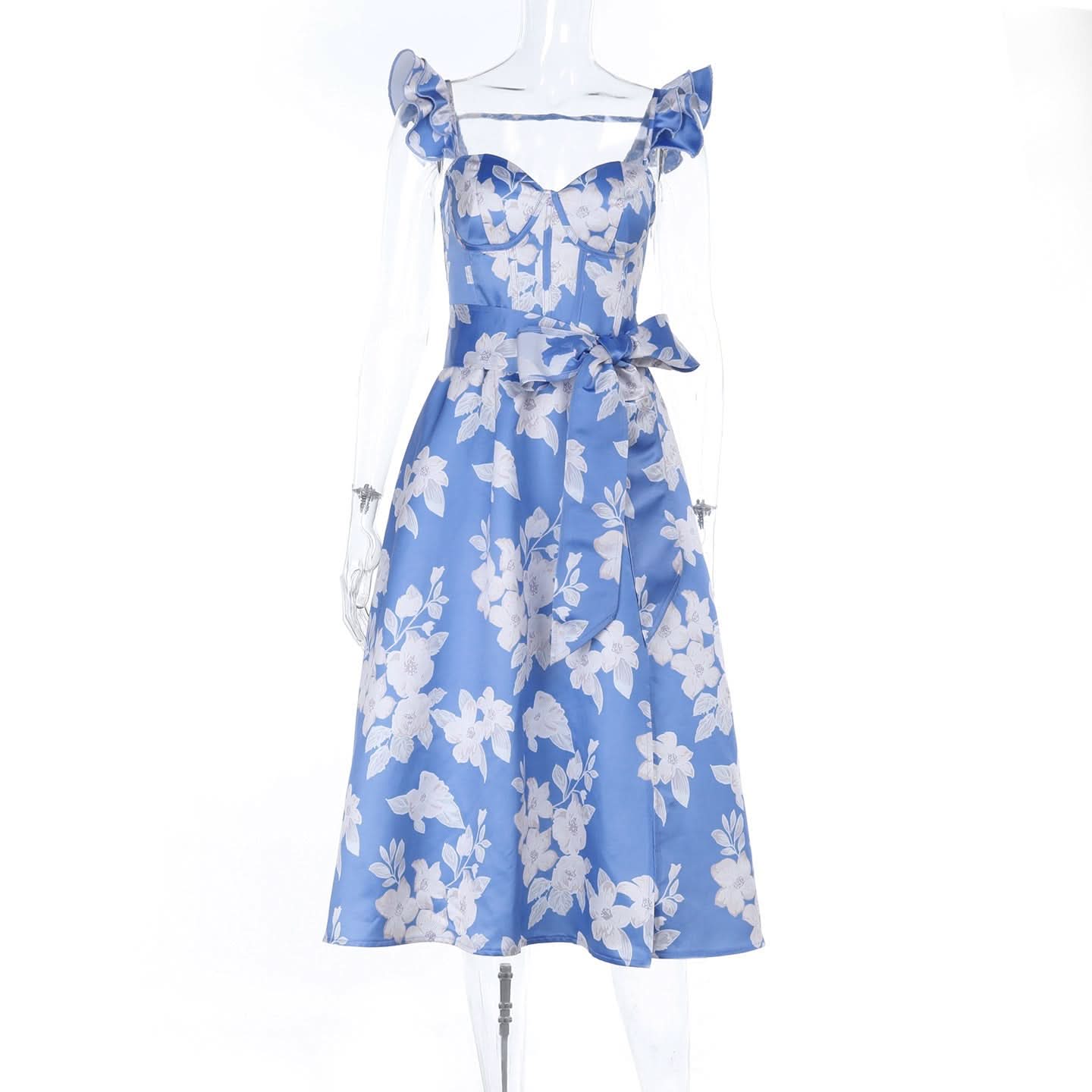 Ruffle flower print zip-up slit v neck midi dress