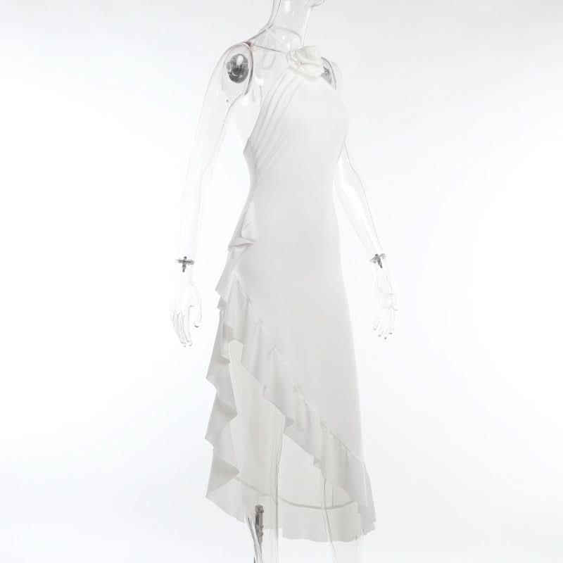 Ruffle irregular flower applique halter slit midi dress