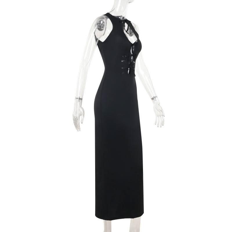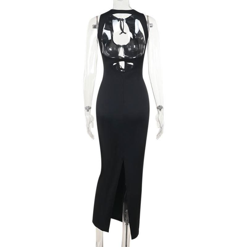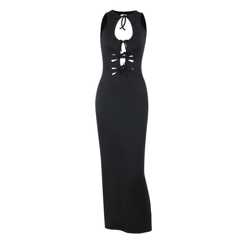 Self tie hollow out crewneck slit solid cut out midi dress