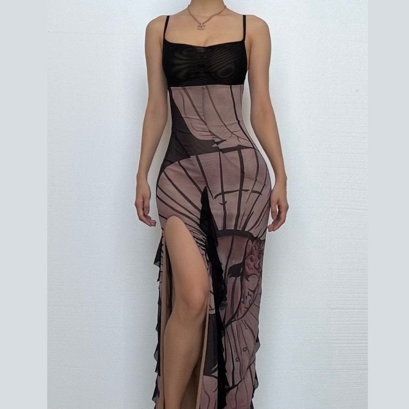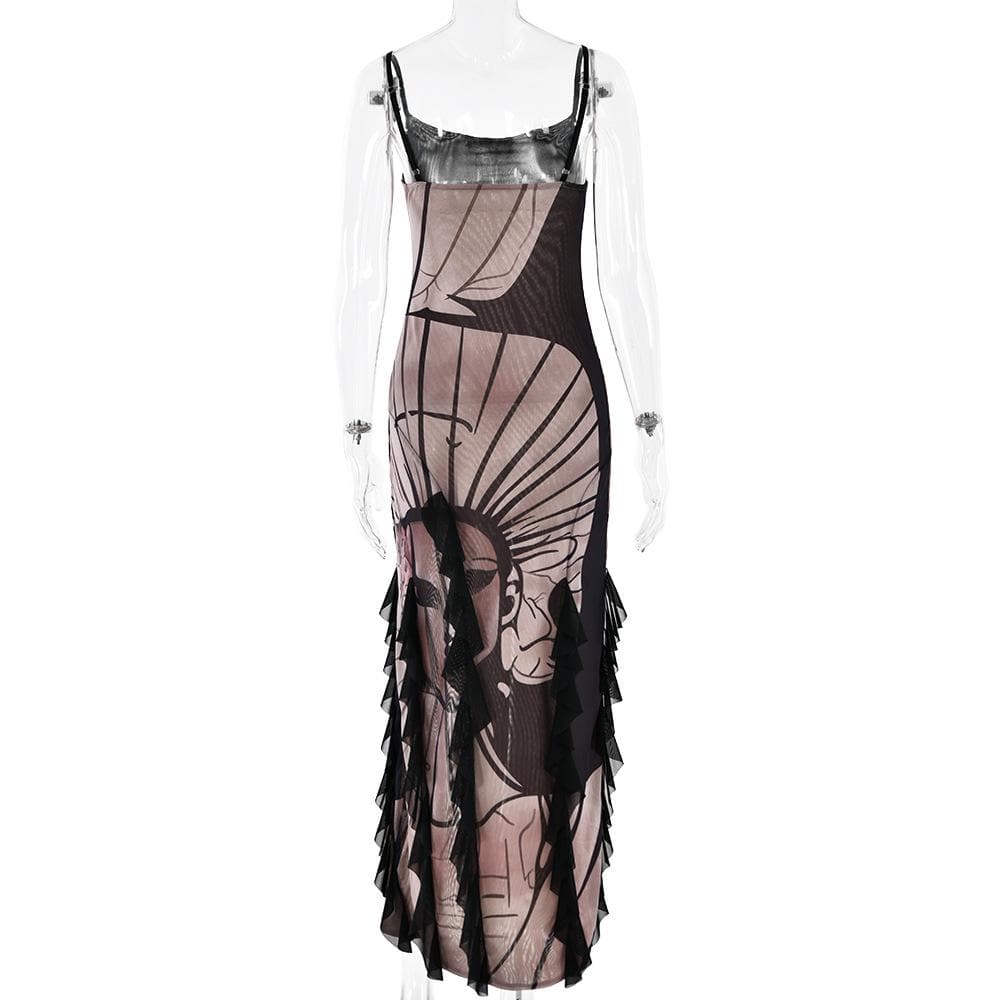 Sheer mesh print abstract ruffle patchwork cami midi dress