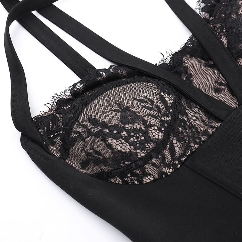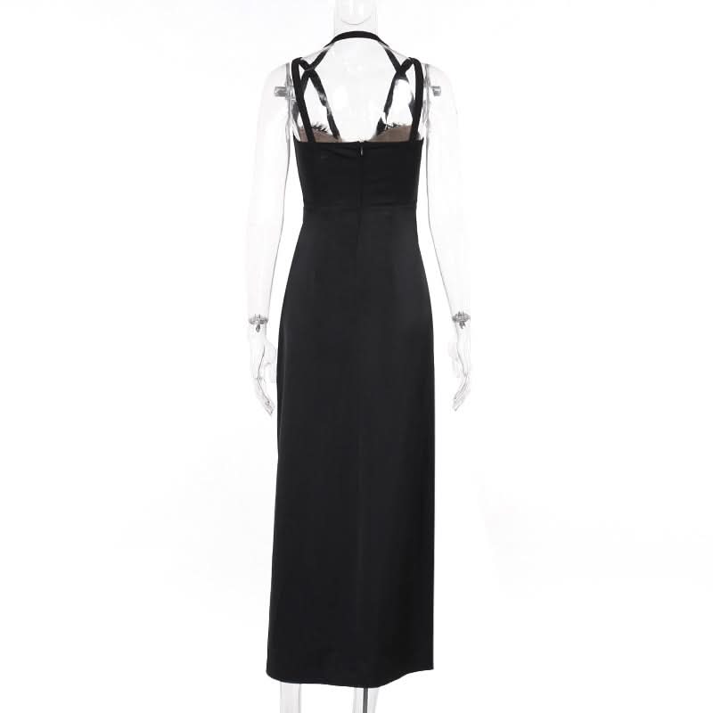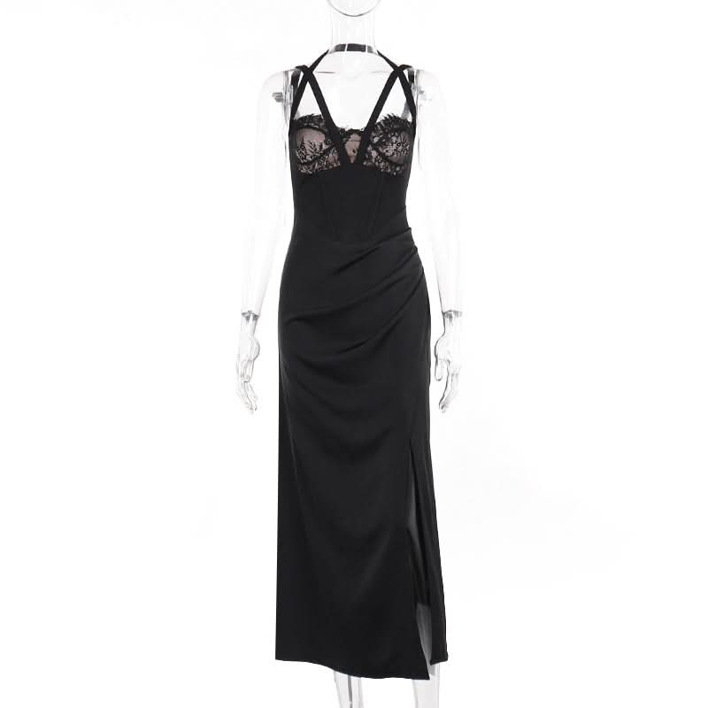Slit zip-up lace ruched halter backless midi dress