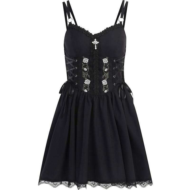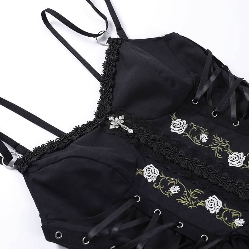 Sweetheart neck embroidery ruffle lace up cami mini dress