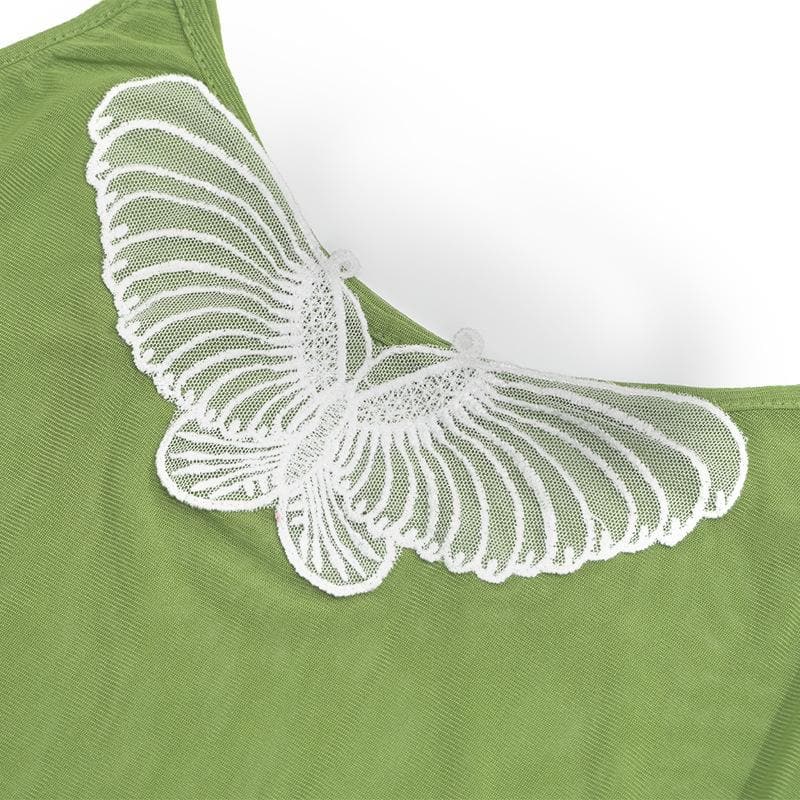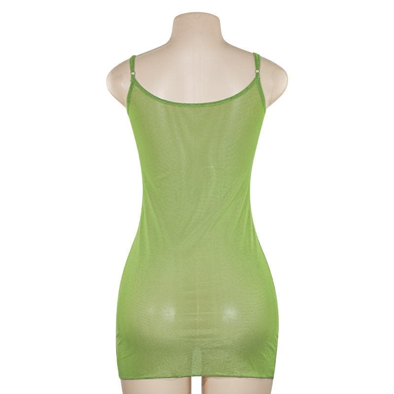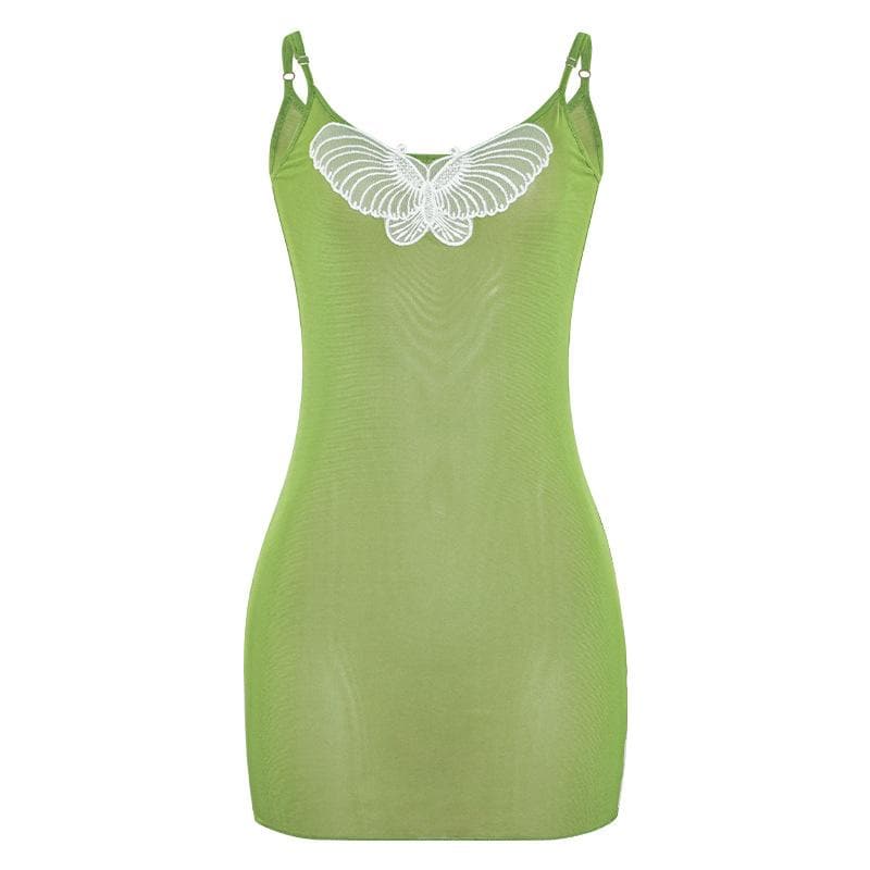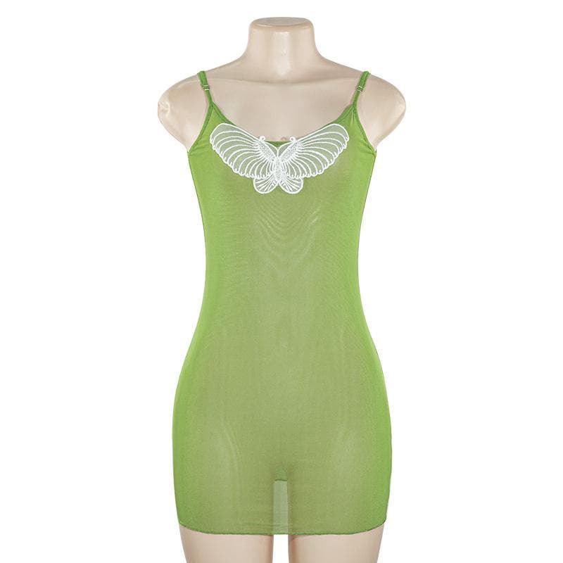 U neck butterfly embroidery sheer mesh cami mini dress
