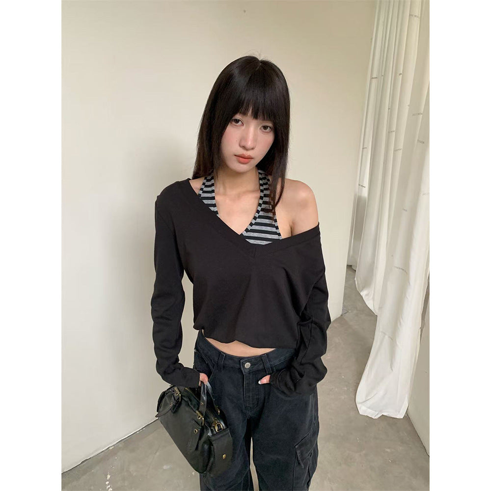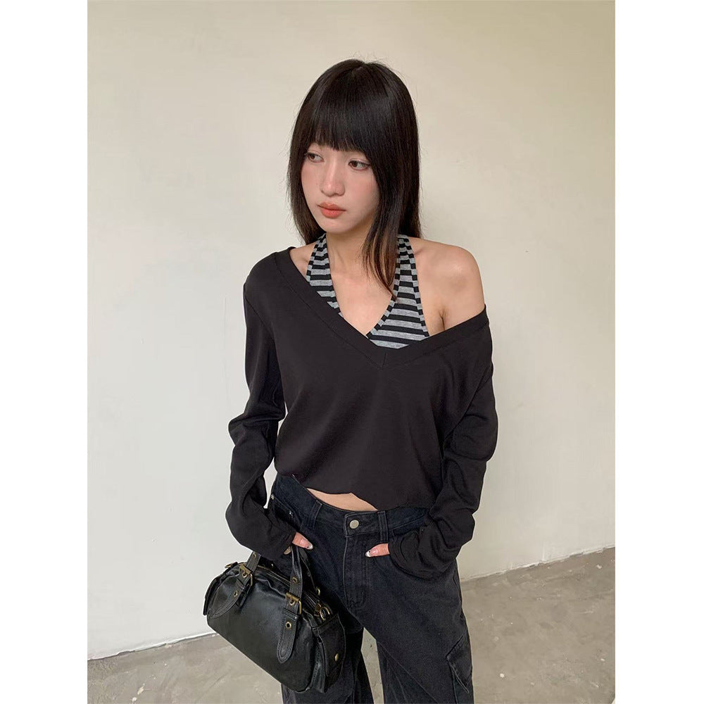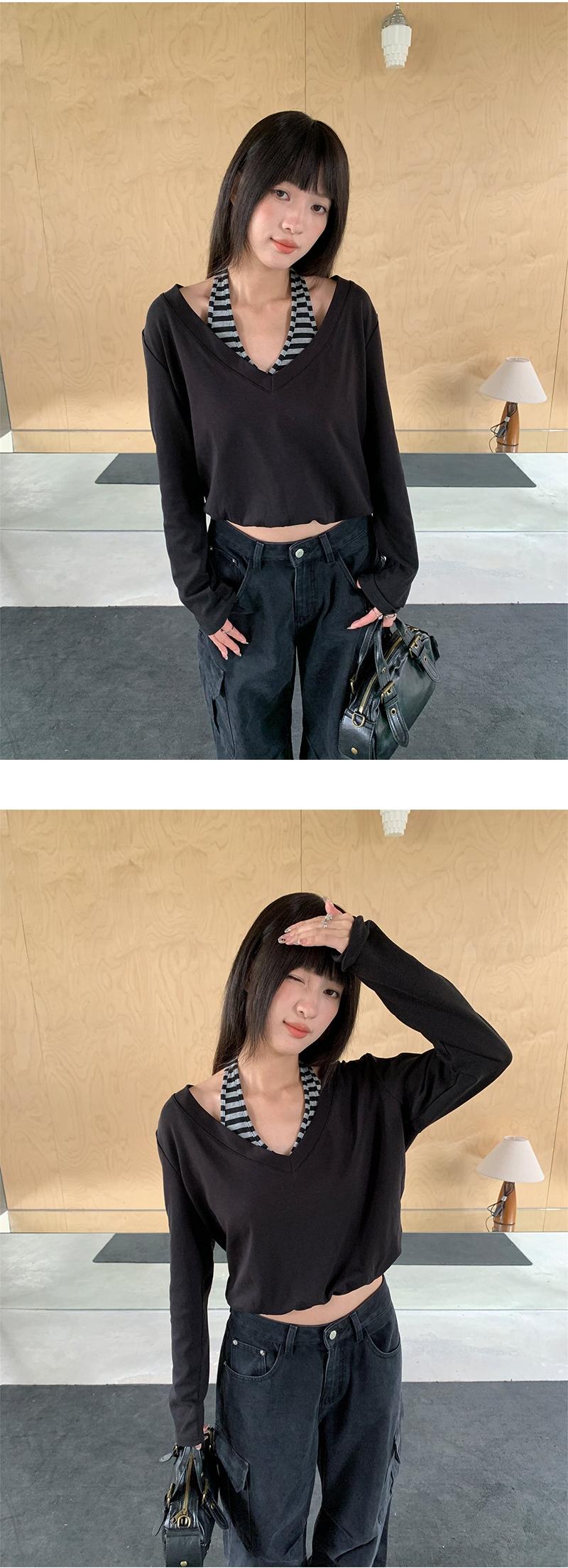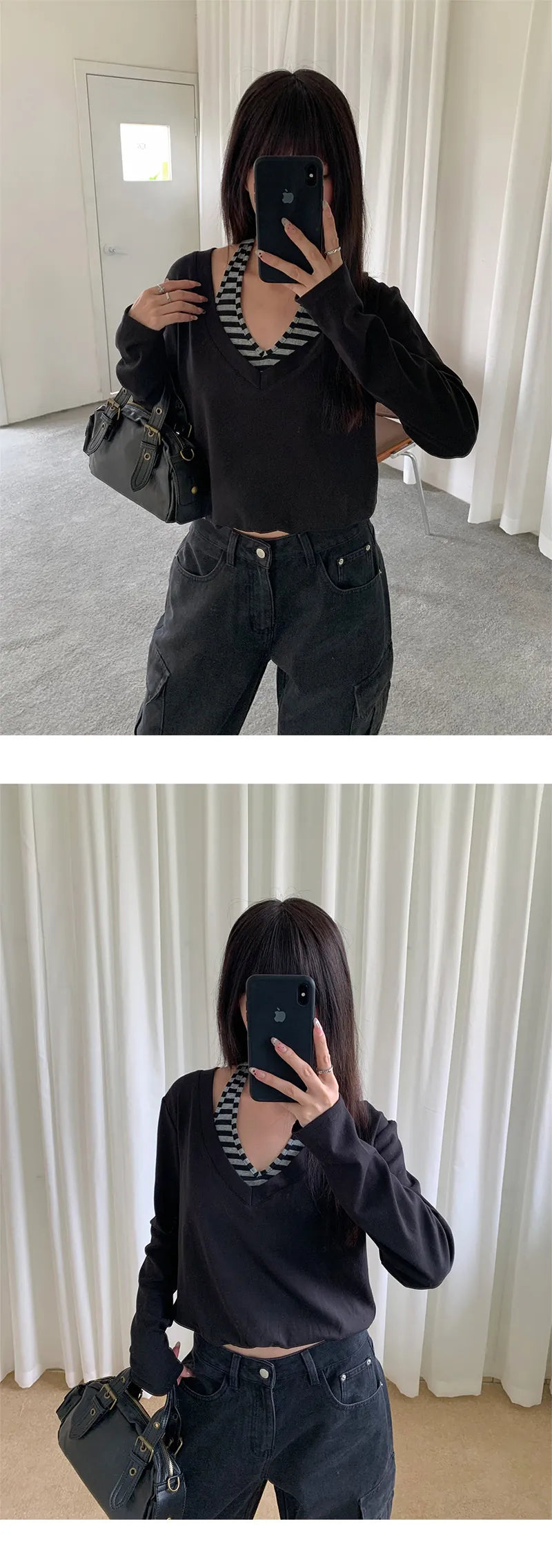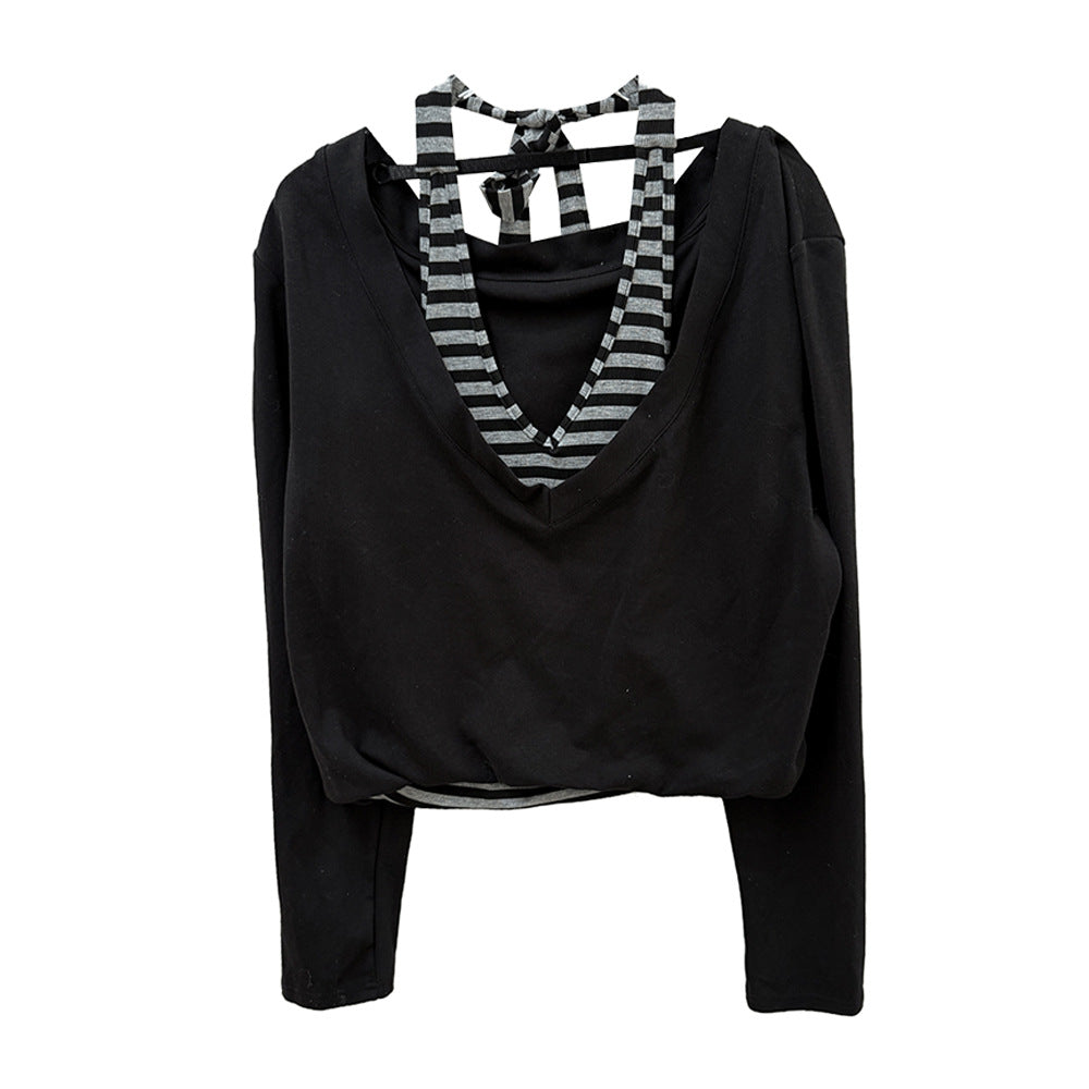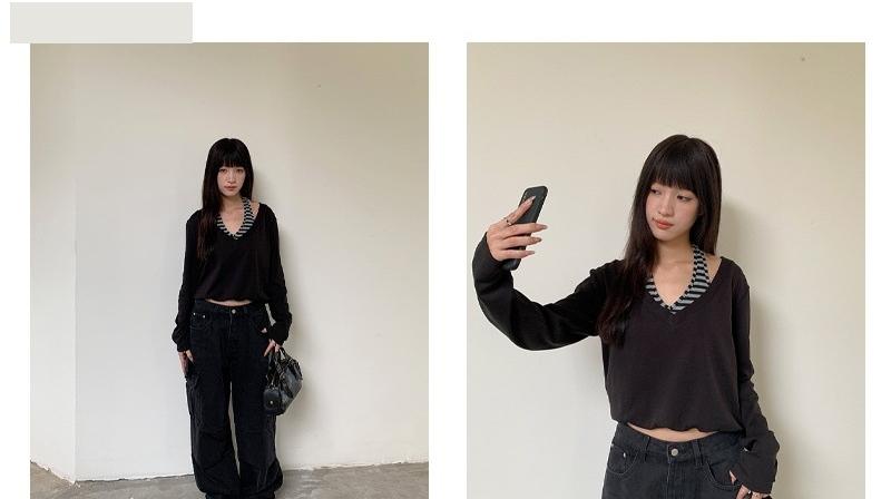 —V collar, Leisure, Two fakes, Contrast color, Splicing