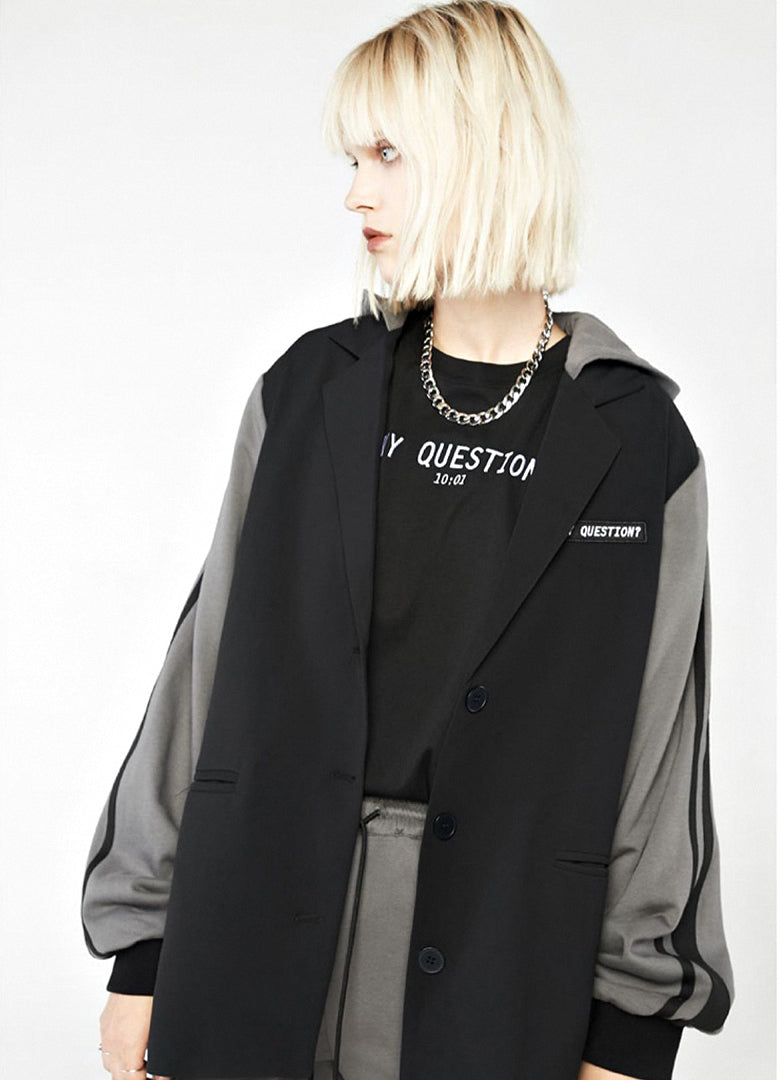 The large straight suit style, with spliced sweater sleeves and sweater hood, makes the silhouette more unique and individual. It is a versatile jacket for spring and autumn, making it easy to wear casual street style