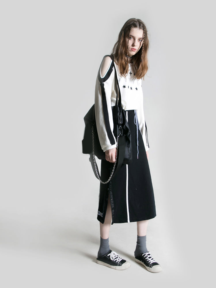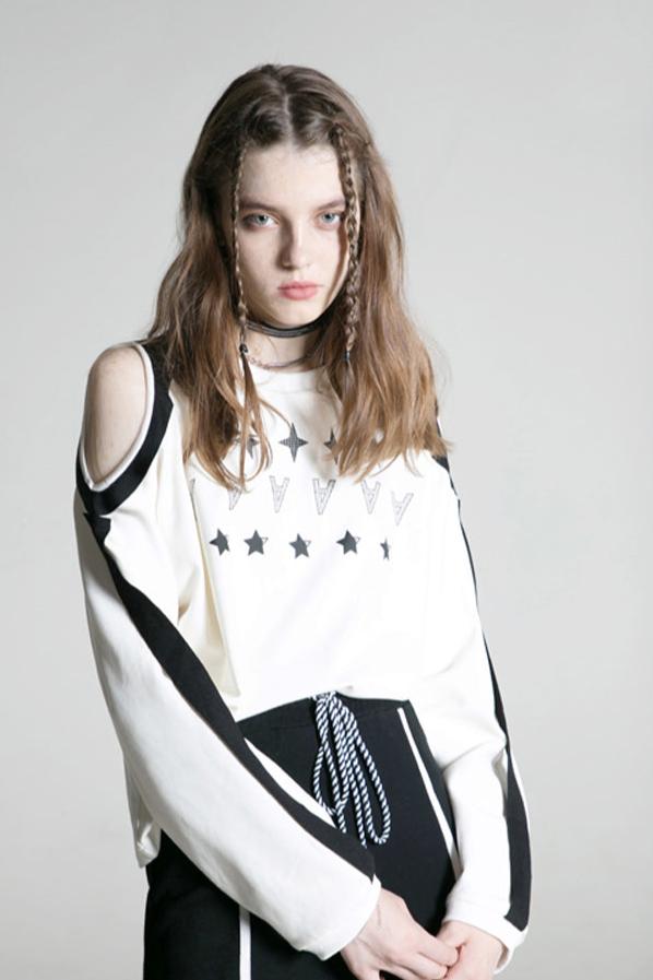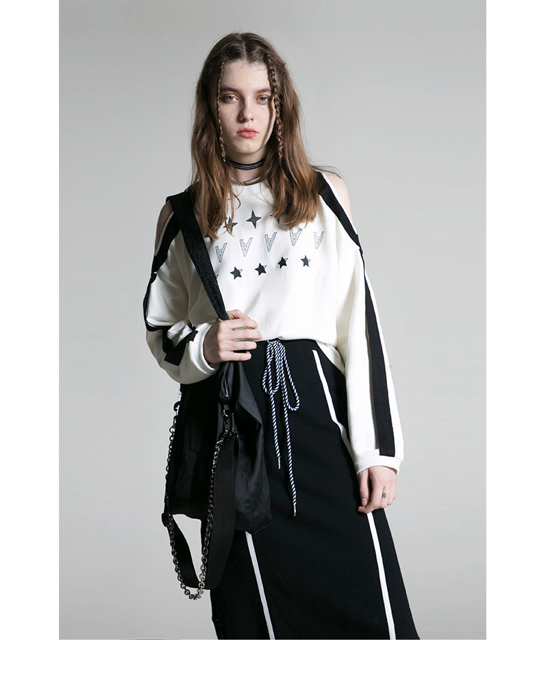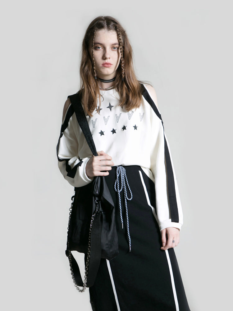 [AnyQ] Contrasting print stripe off-shoulder T-shirt