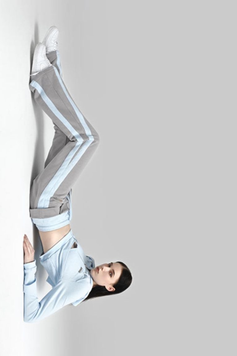 • The silver brand logo on the chest echoes the silver zipper on the placket. Selected glacier blue barley pique fabric creates a special texture and delicate feeling.