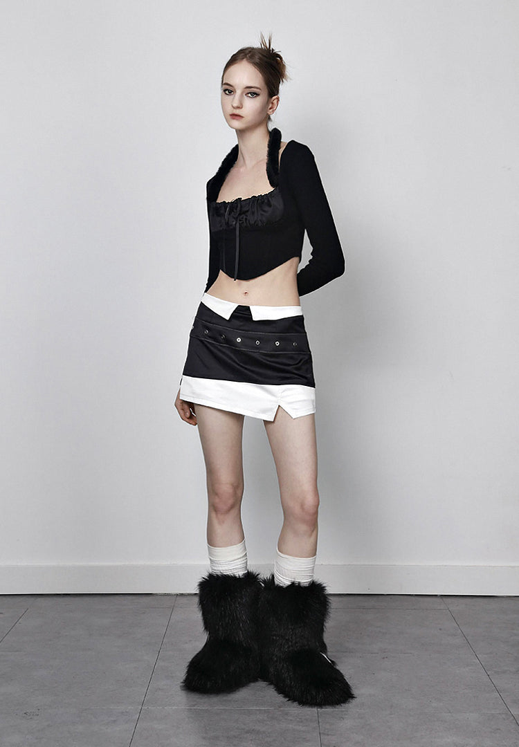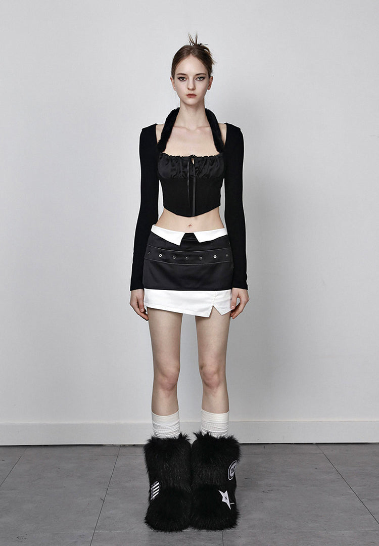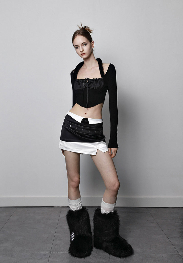 • The ribbed cotton knitted fabric/silky acetate fabric is spliced ​​and matched with a wool strip halter neck, and the collision of different materials creates a unique temperament.
