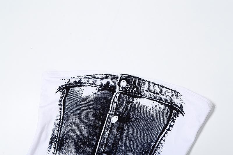 Contrast denim print slit backless tube maxi skirt set