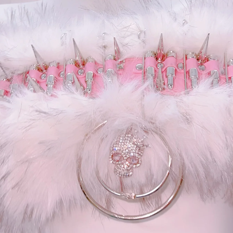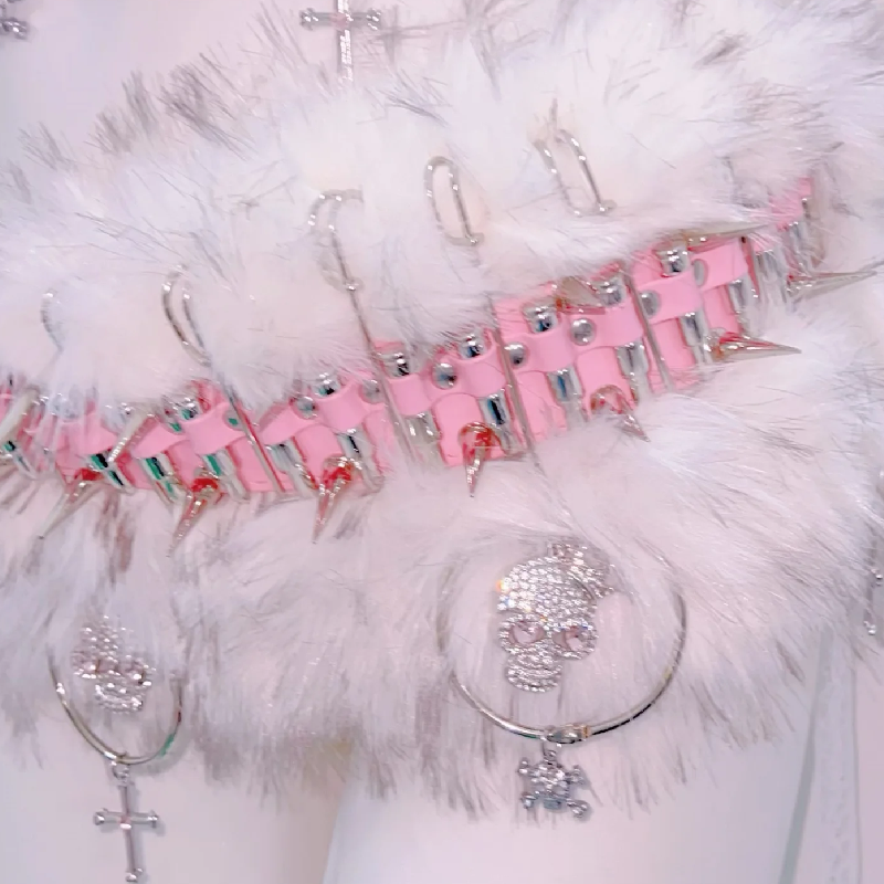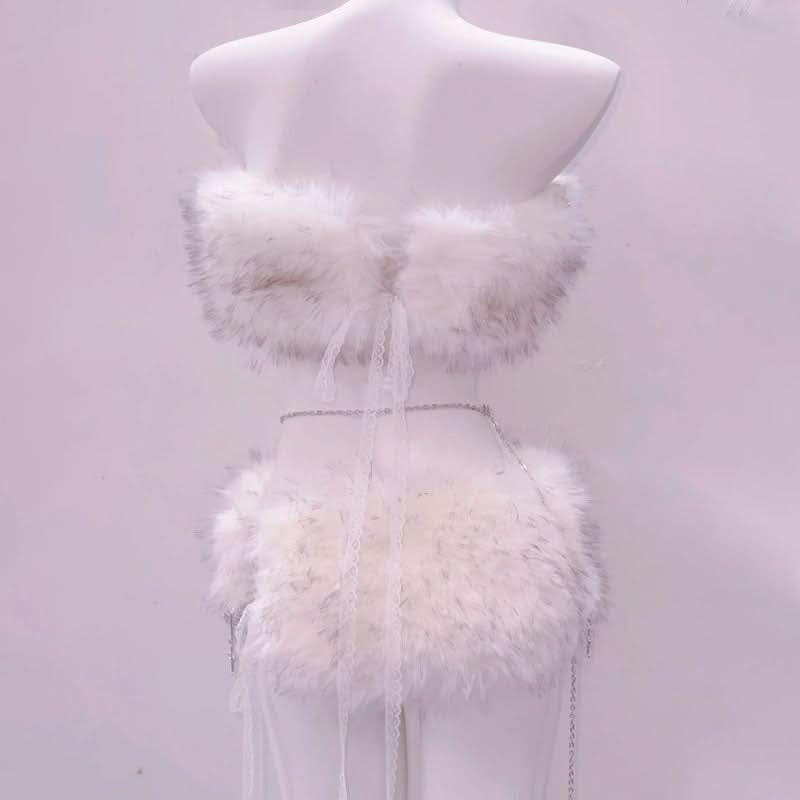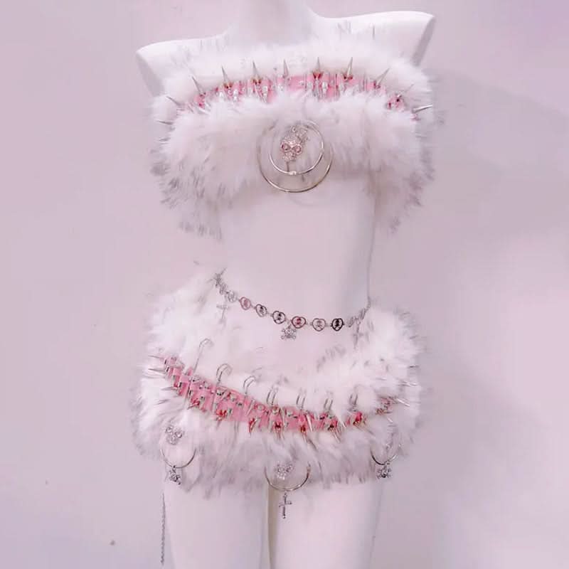 Fluffy o ring skull applique lace hem self tie mini skirt set