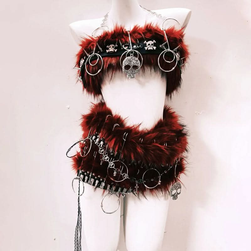 Fluffy o ring skull applique metal chain mini skirt set