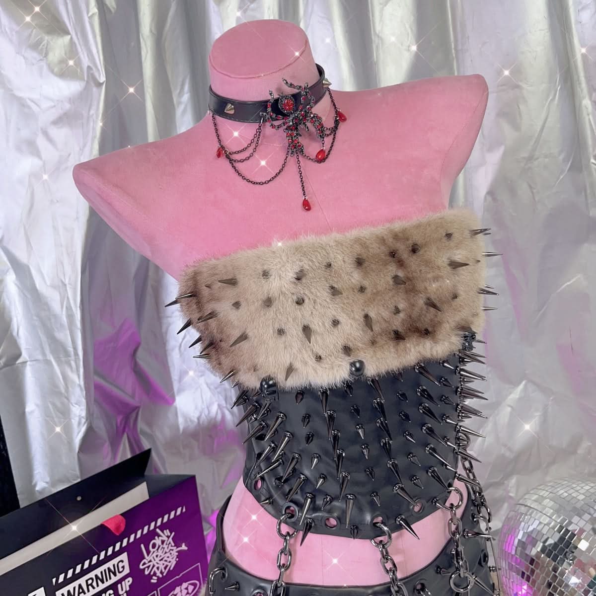 Fluffy metal chain rivet PU leather tube mini skirt set