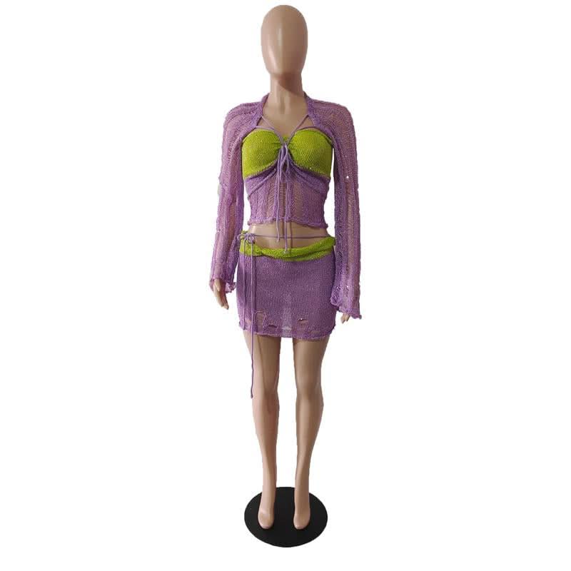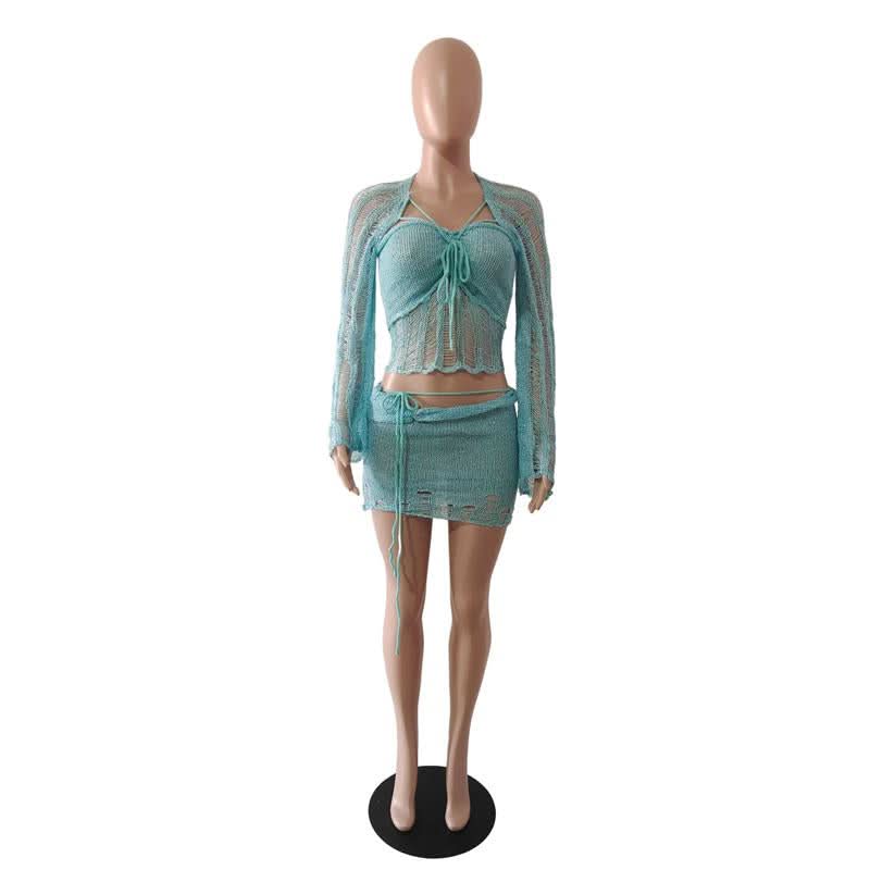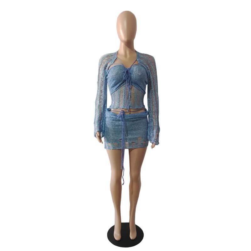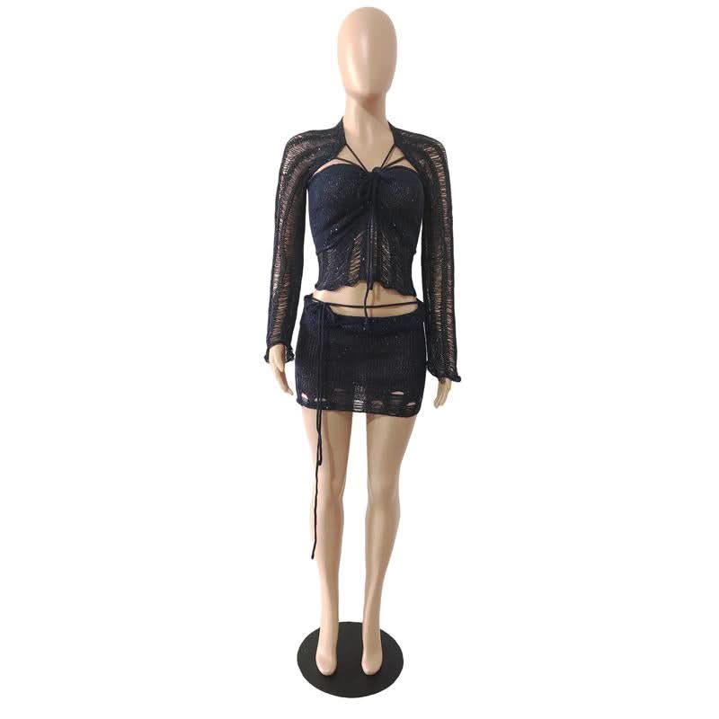 Glitter knitted long sleeve hollow out 3 piece mini skirt set