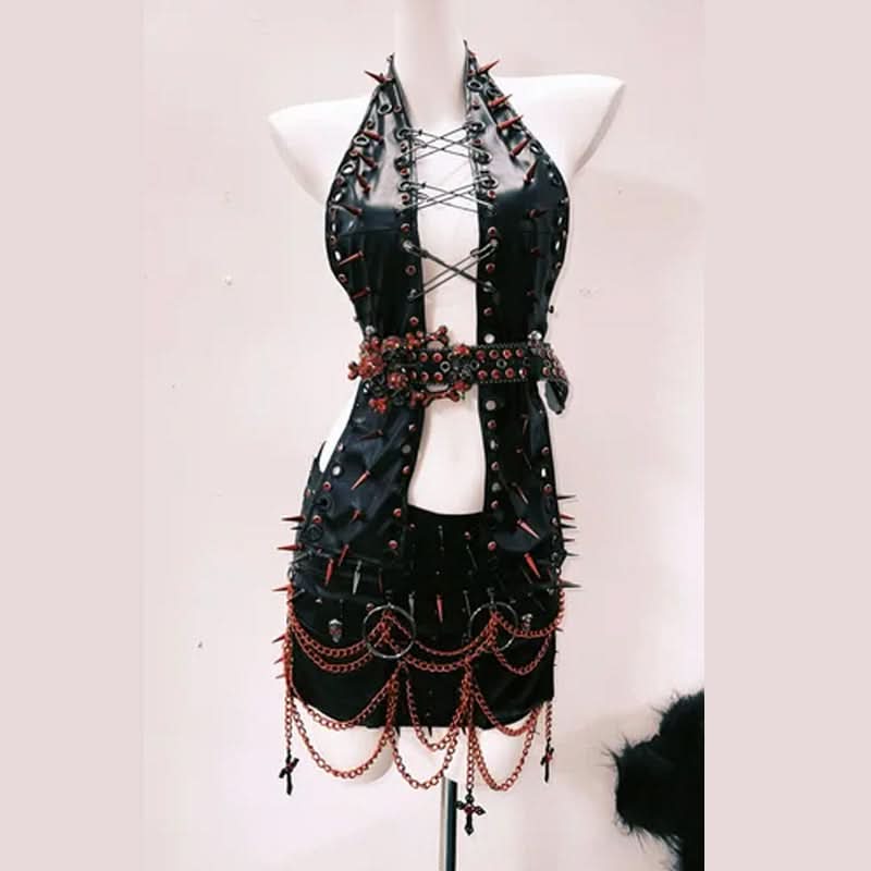 Halter hollow out rivet applique metal chain mini skirt set