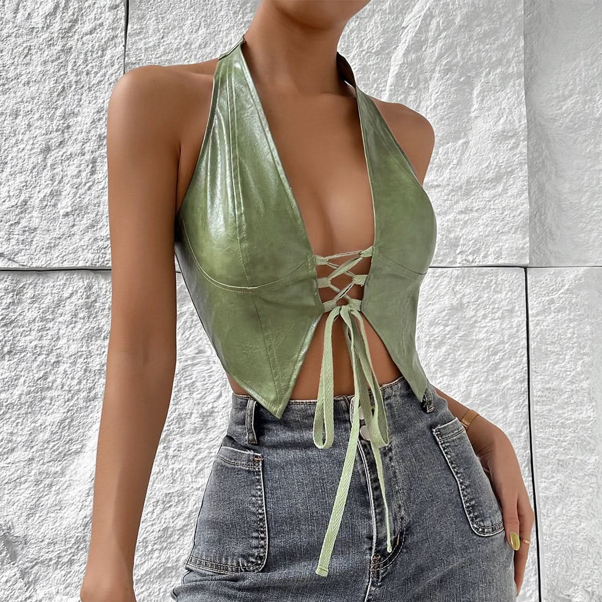 Halter PU leather lace up top