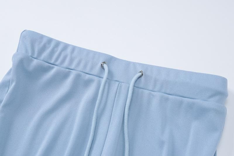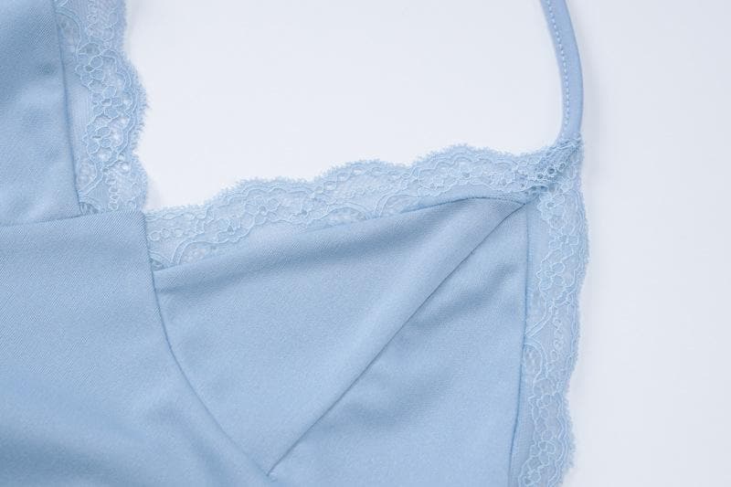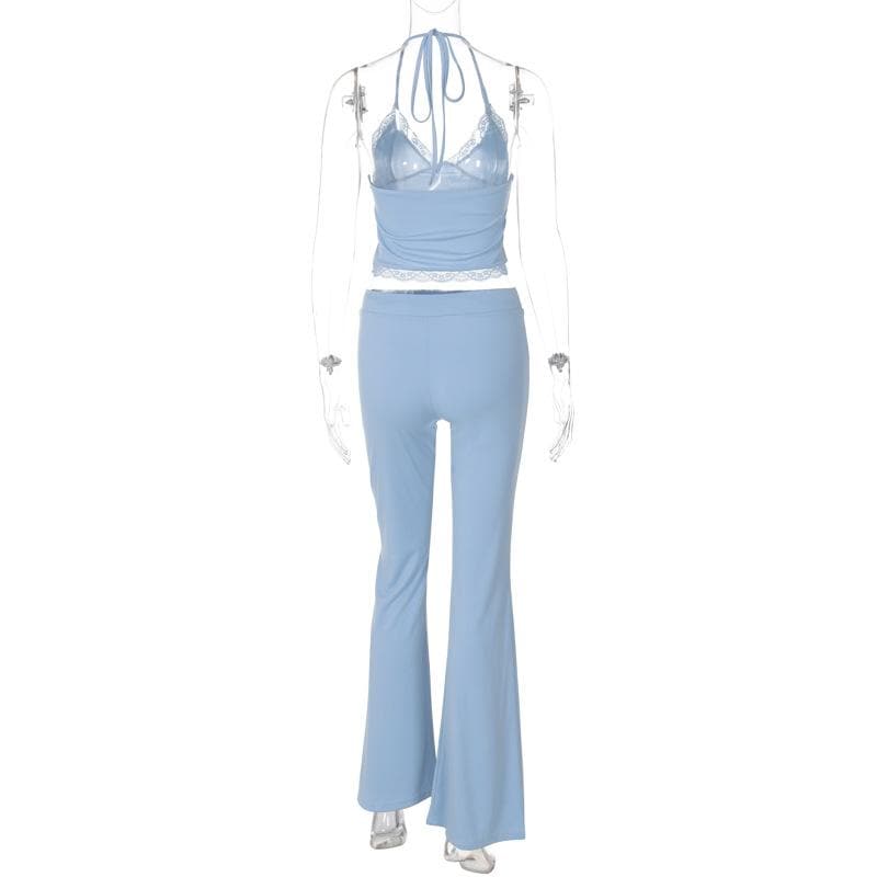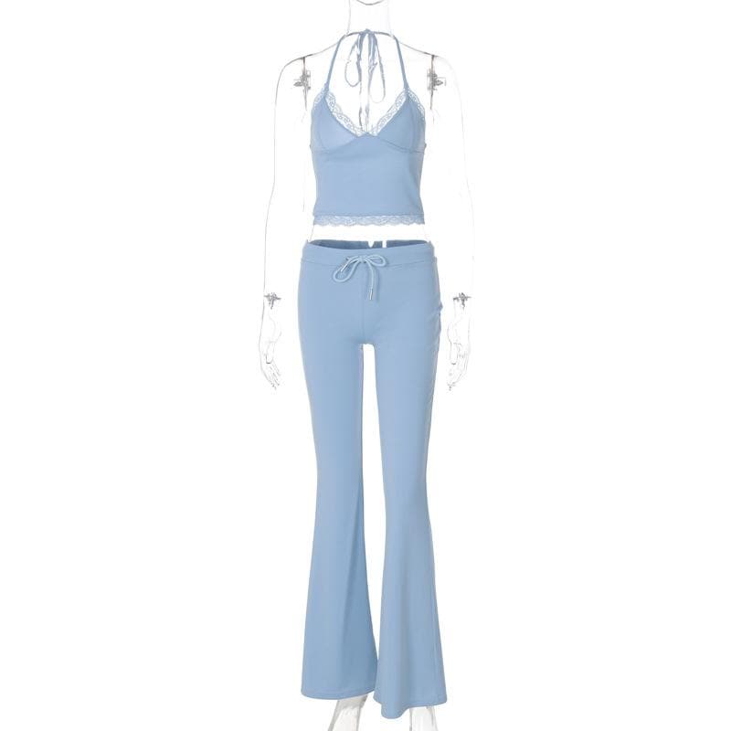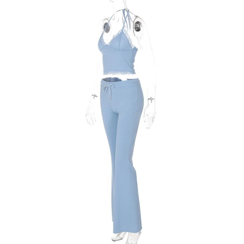 Halter v neck drawstring ruched lace hem pant set
