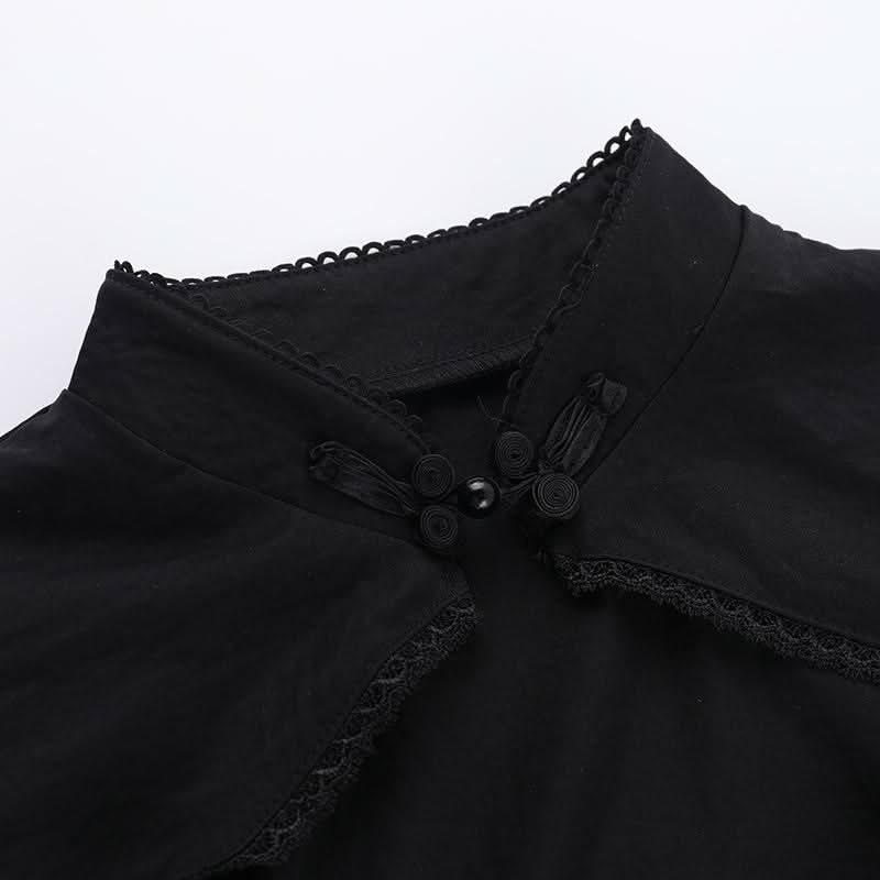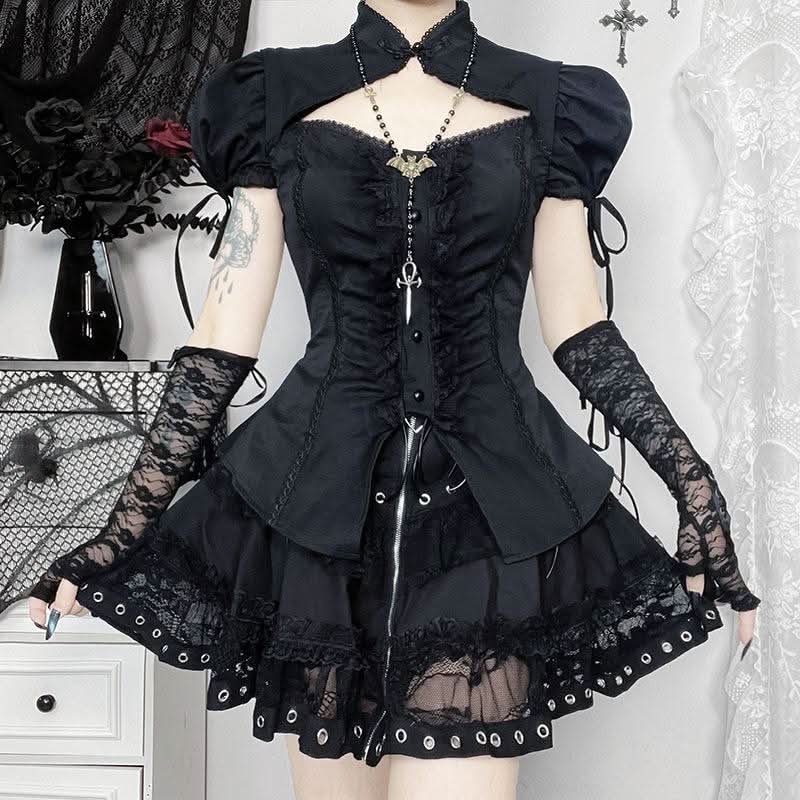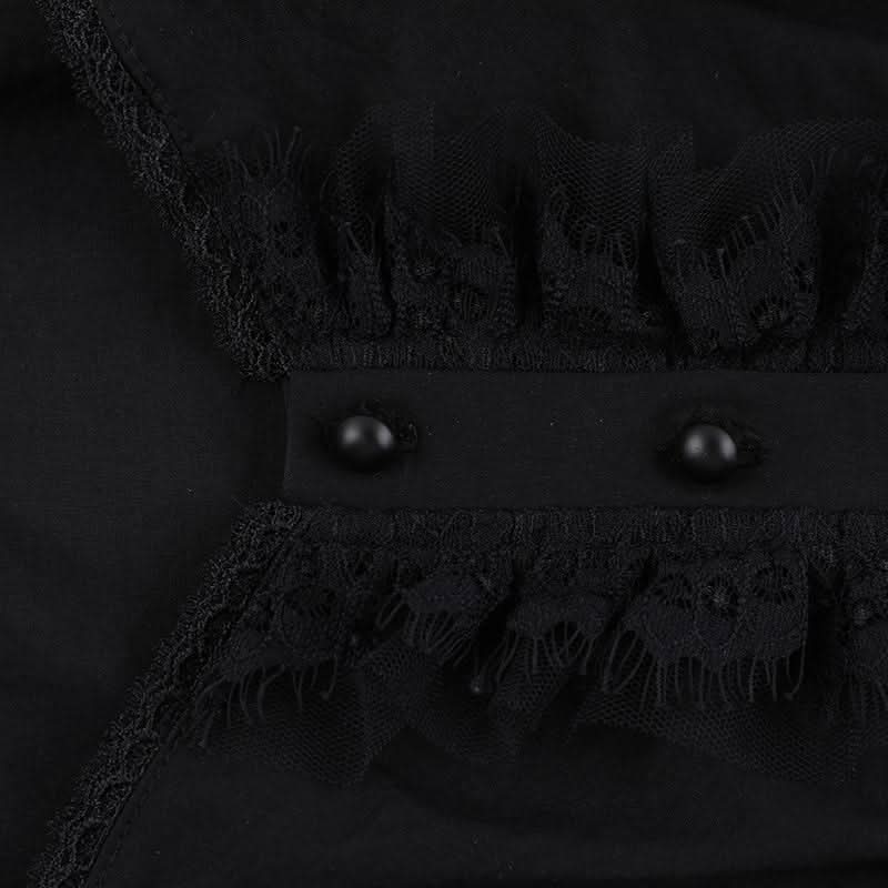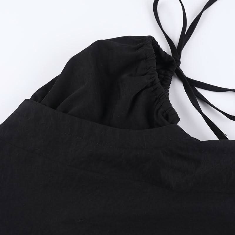 Hollow out button self tie lace hem ruched puff sleeve cut out top