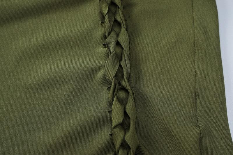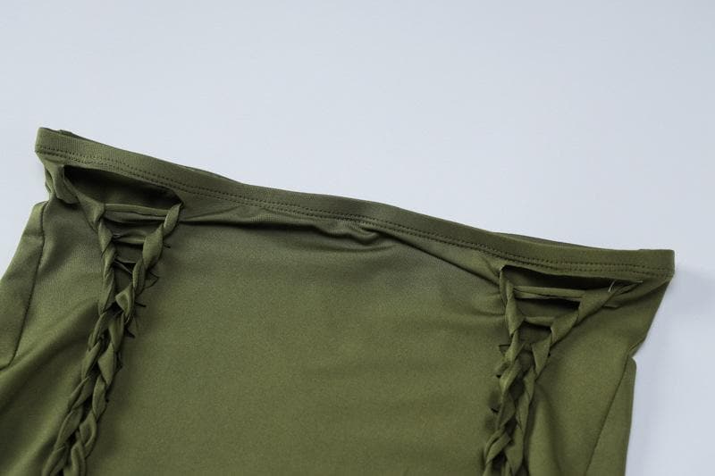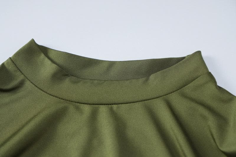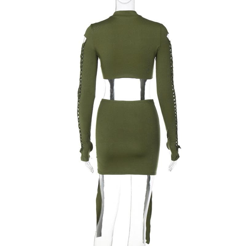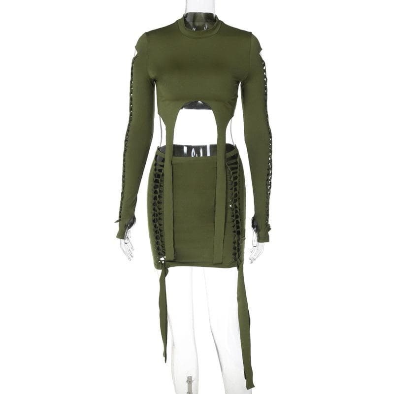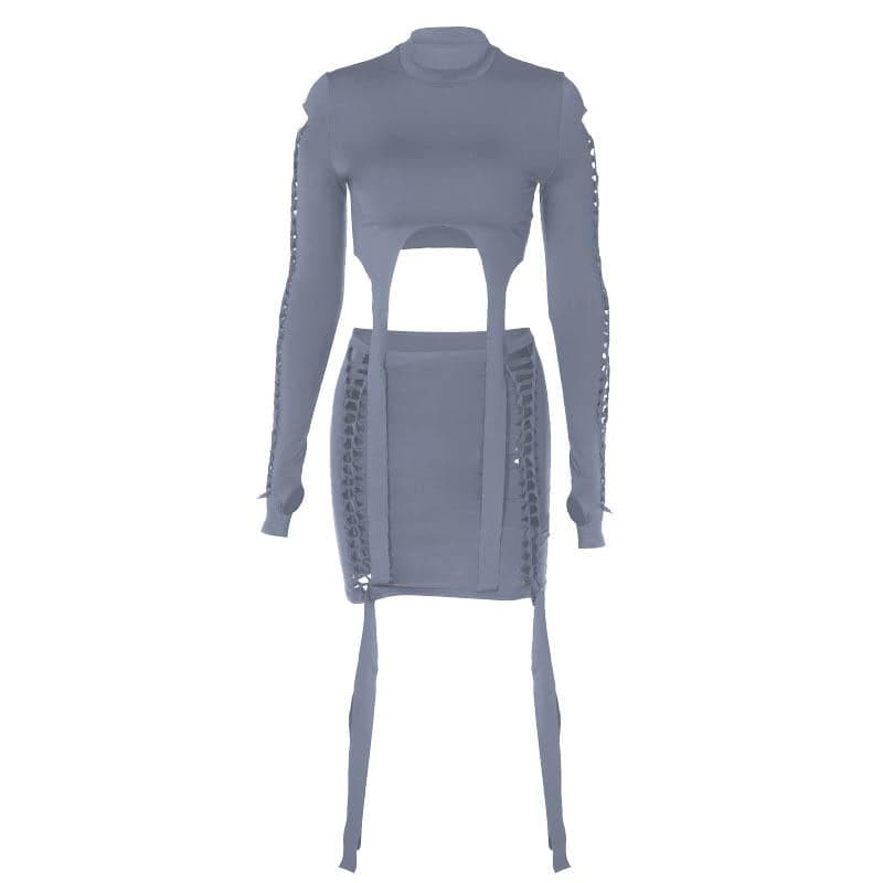 Hollow out high neck long sleeve solid gloves ribbon mini skirt set