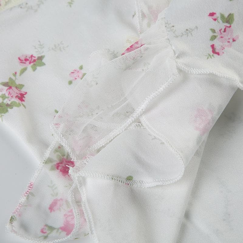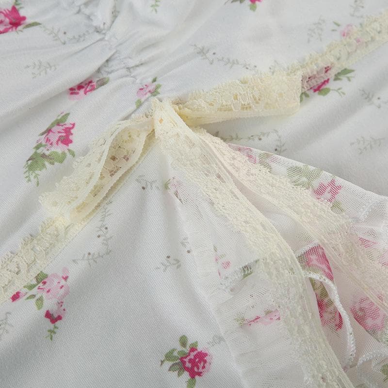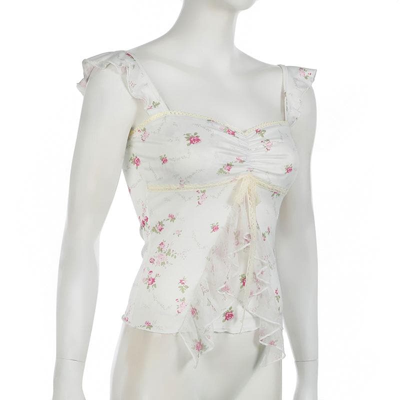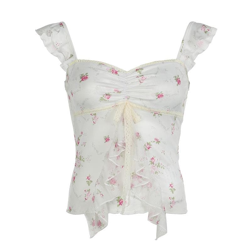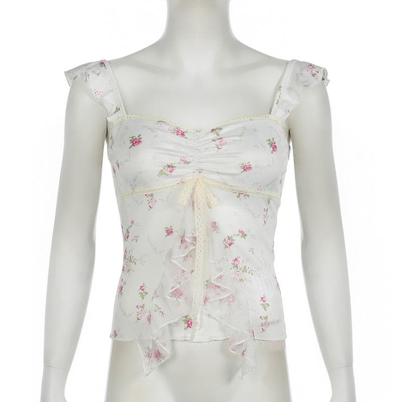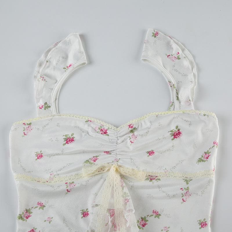 Lace hem bowknot ruched flower print cami top