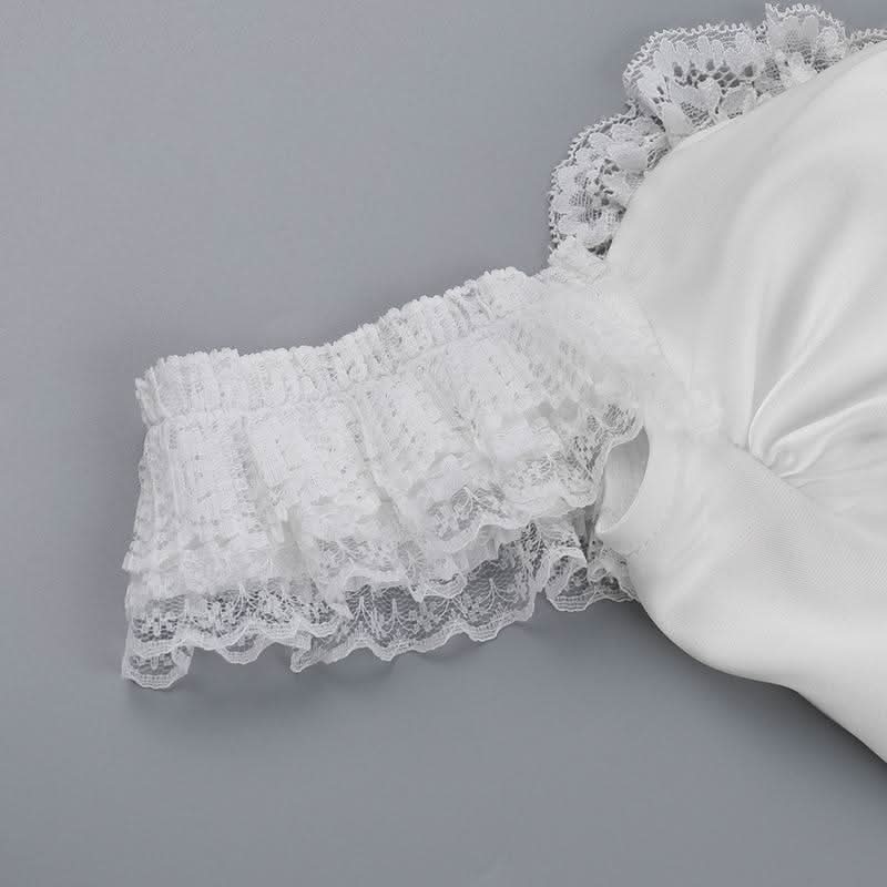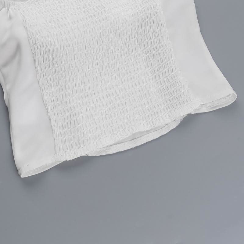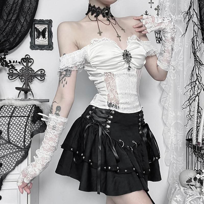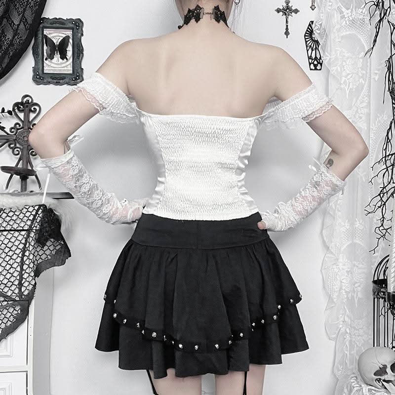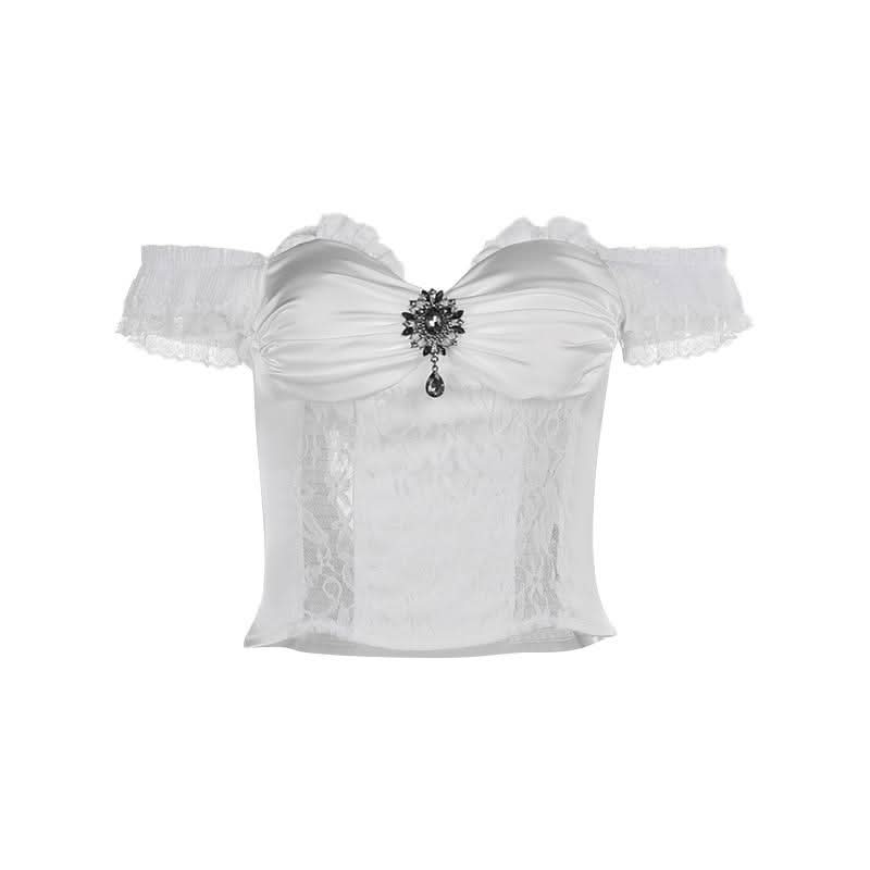 Lace hem off shoulder ruched smocked top