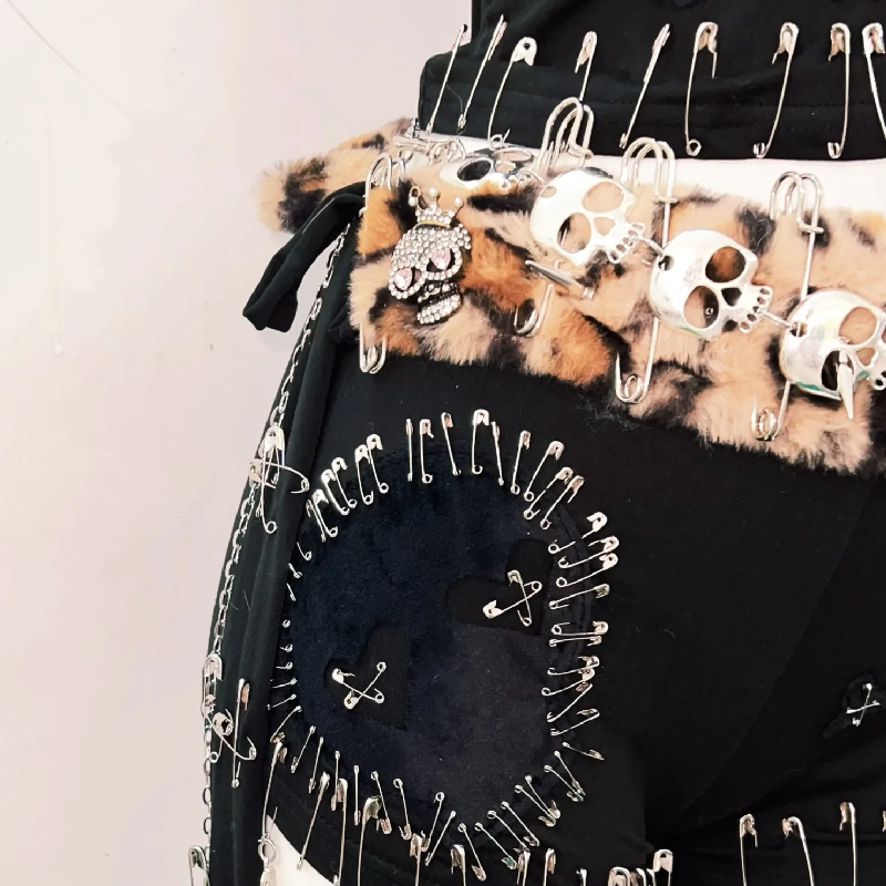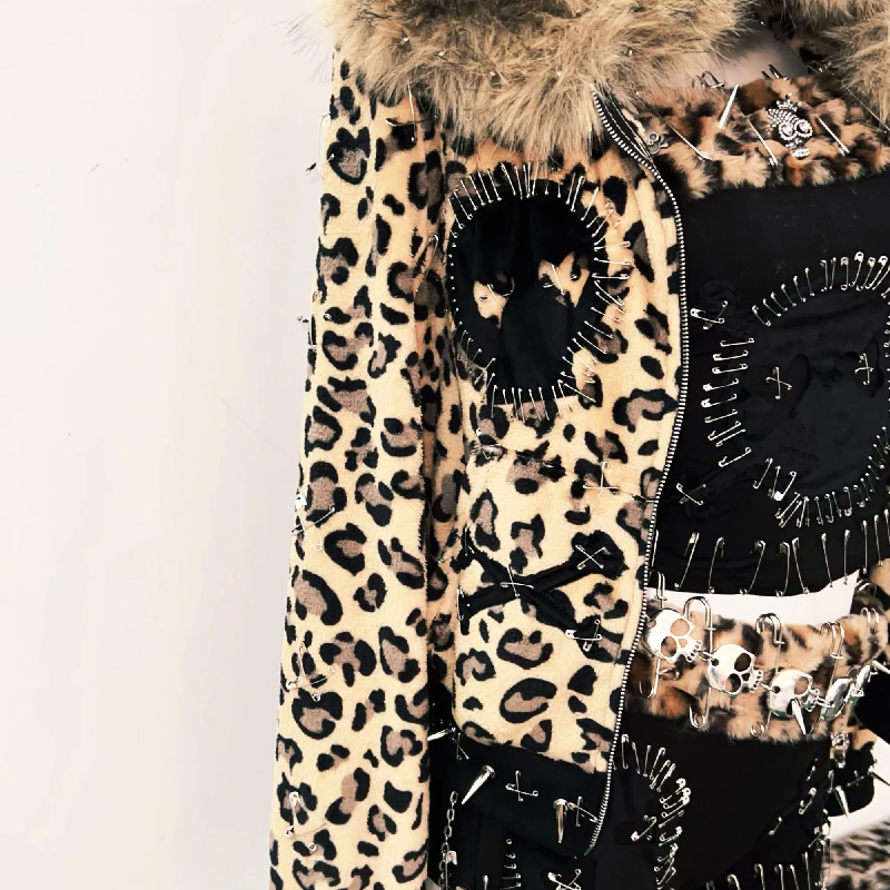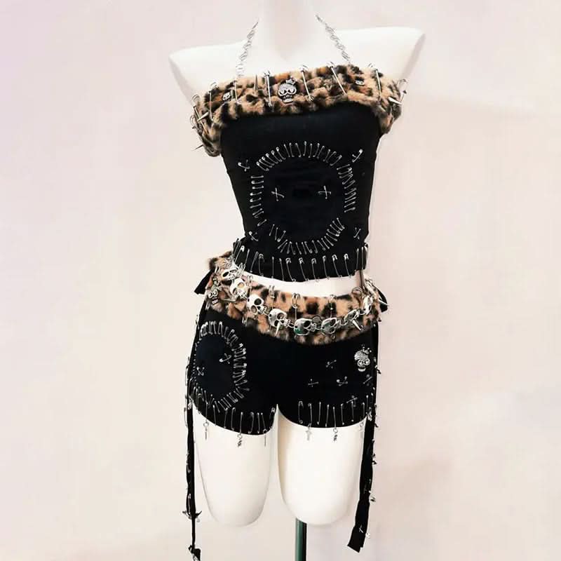 Leopard print metal chainhalter fluffy pant set