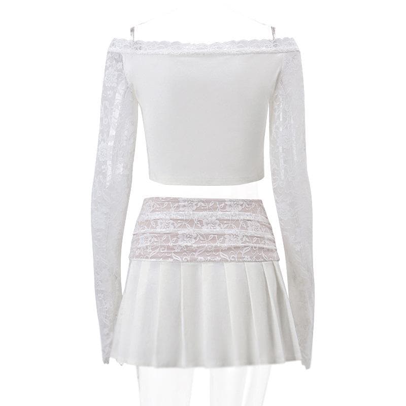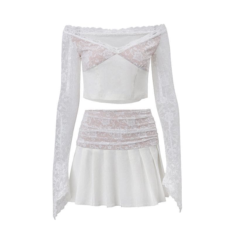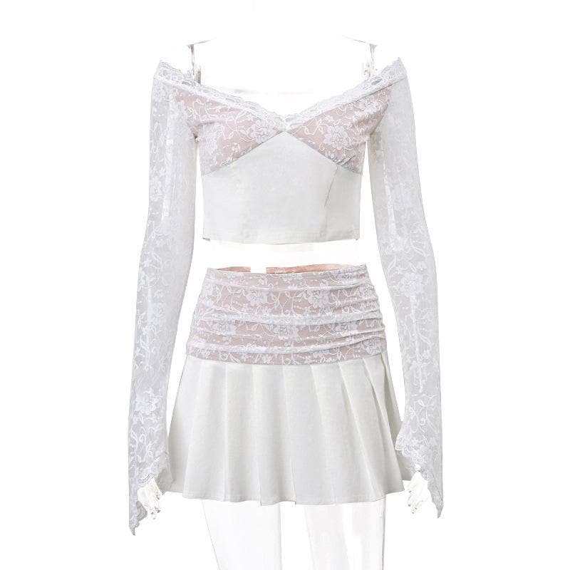Long flared sleeve lace patchwork pleated ruched zip-up mini skirt set