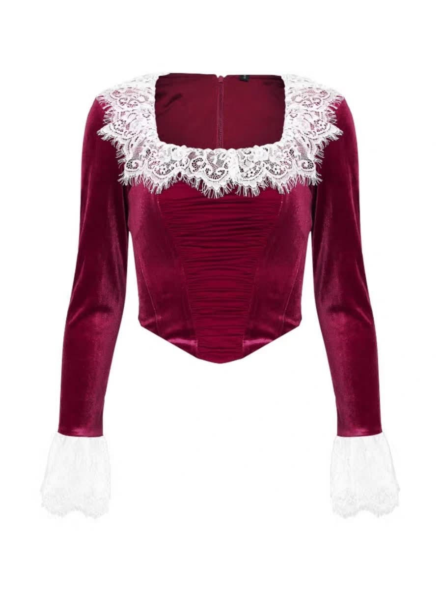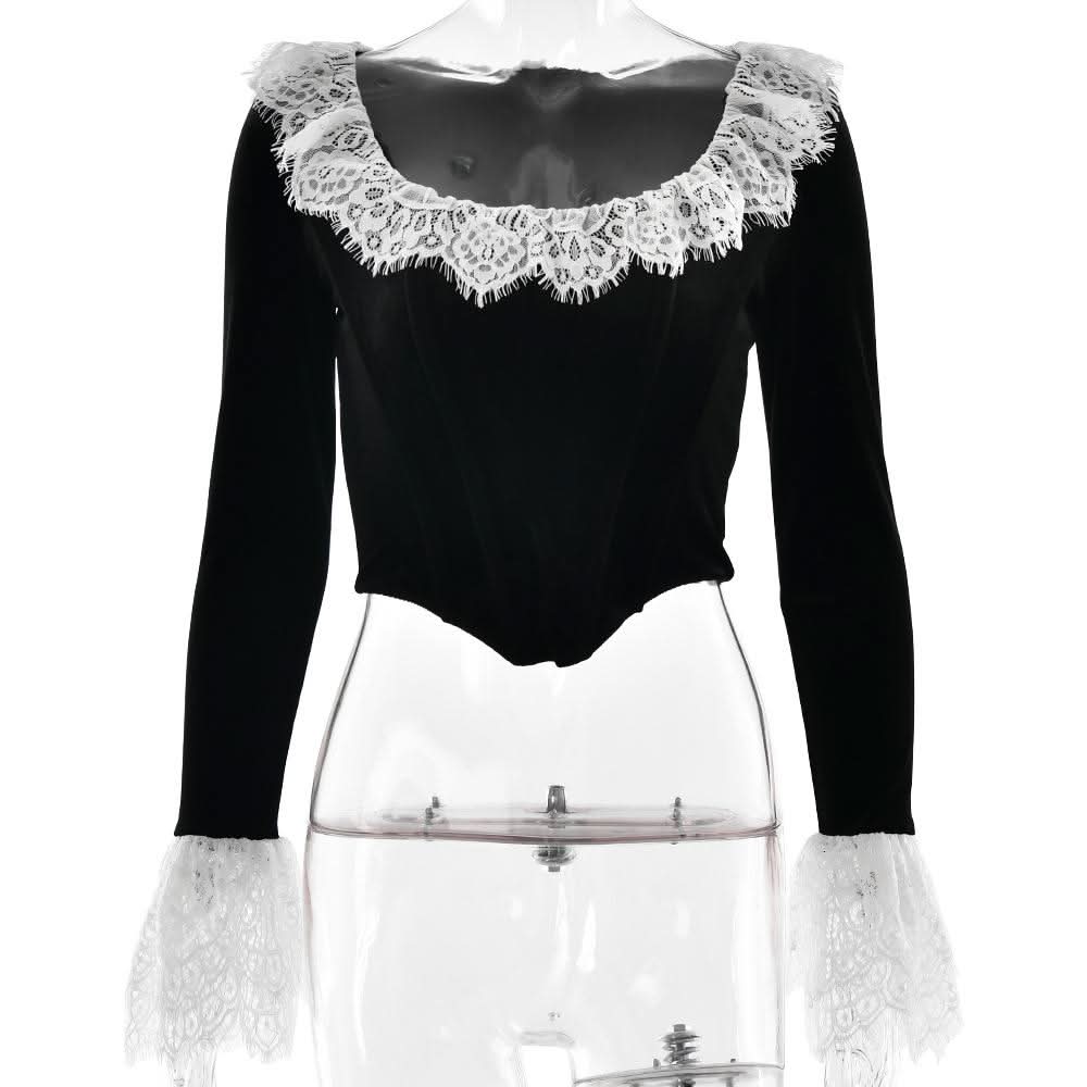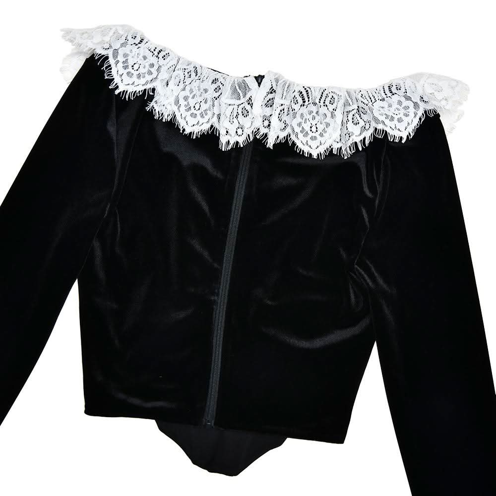 Long flared sleeve lace patchwork velvet zip-up top