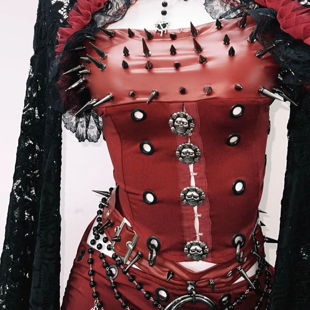 Long flared sleeve PU leather rivet metal chain shrug 3 piece mini skirt set