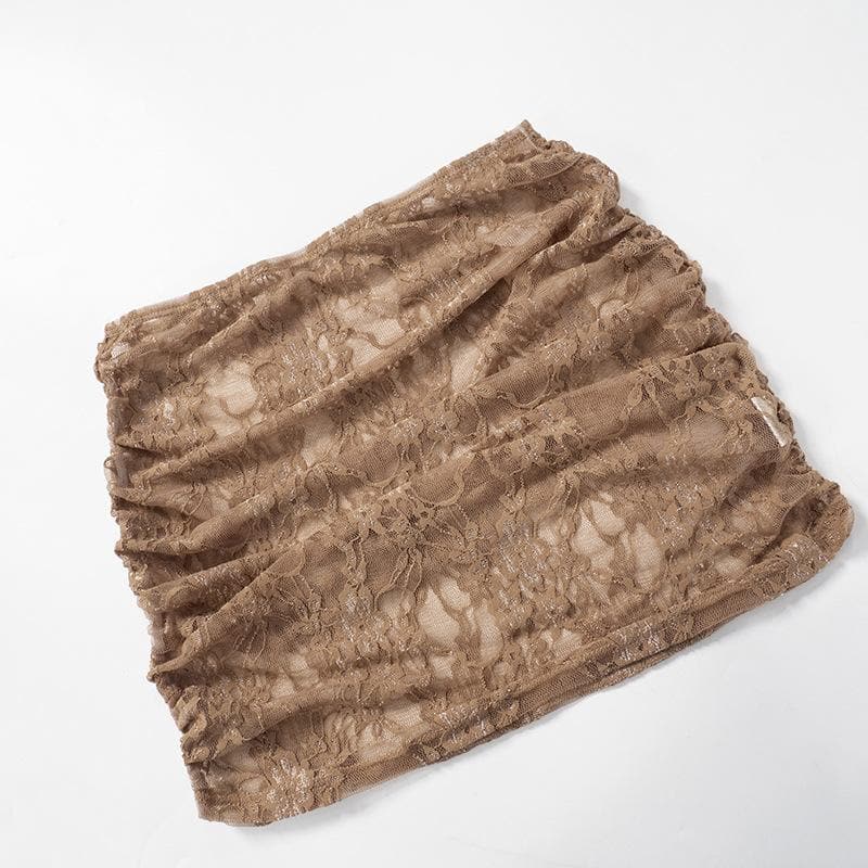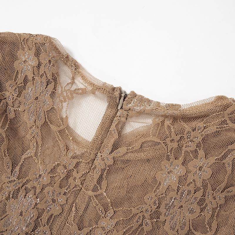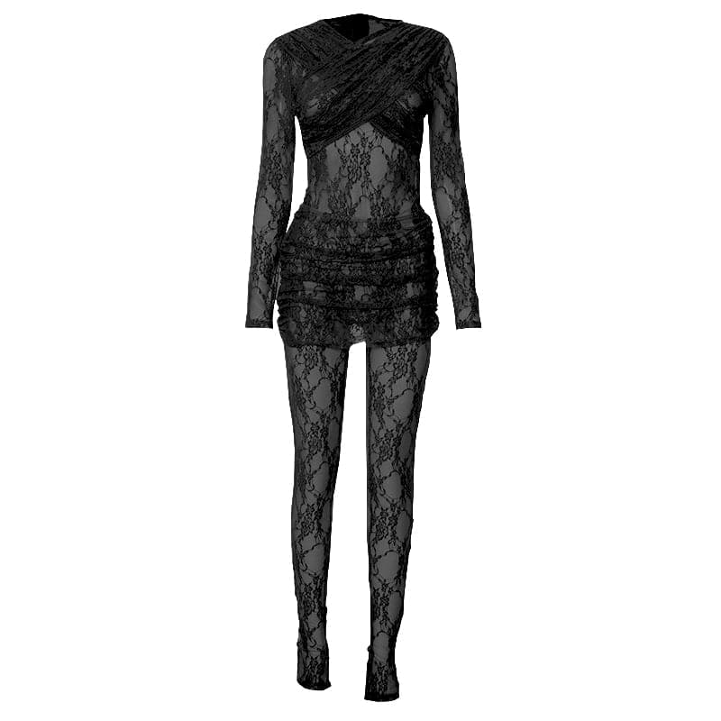 Long sleeve ruched lace zip-up see through 2 piece jumpsuit