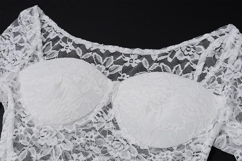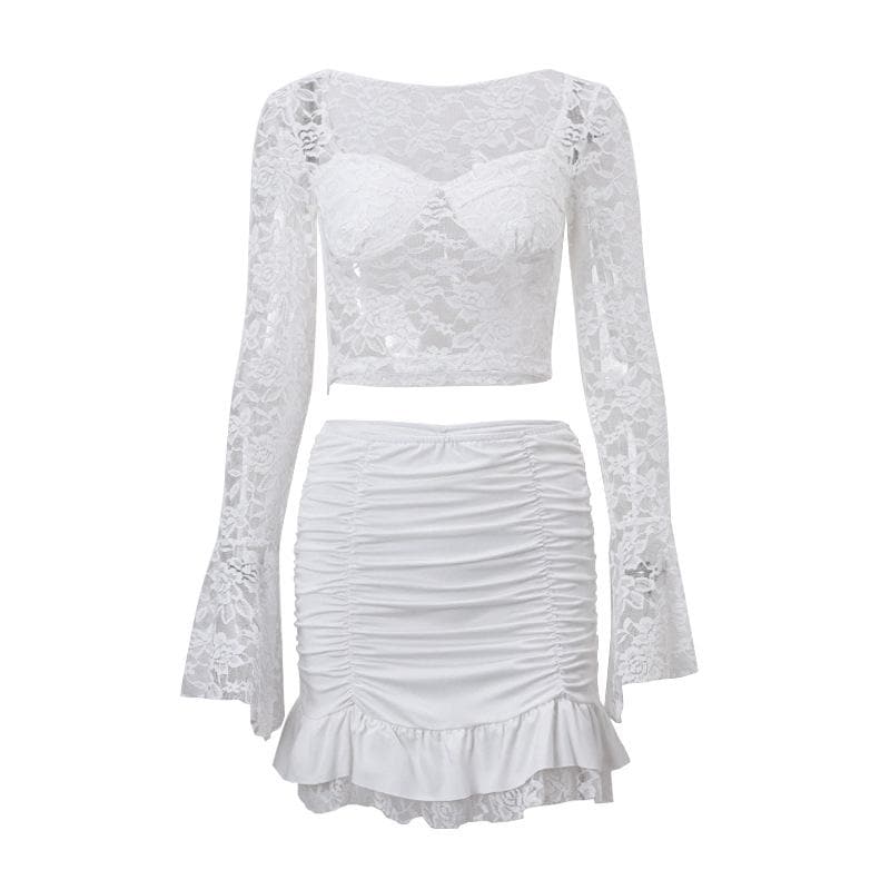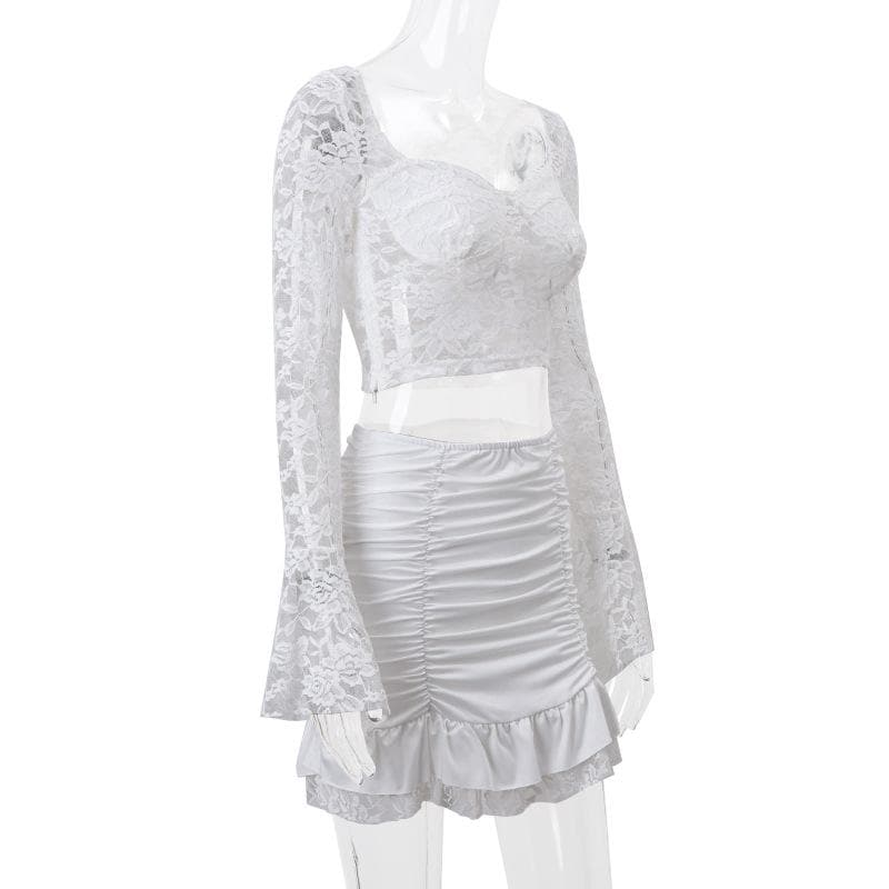 Long flared sleeve sweetheart neck lace ruched ruffle mini skirt set