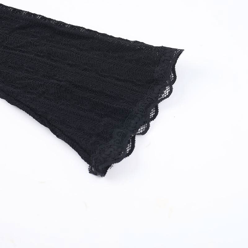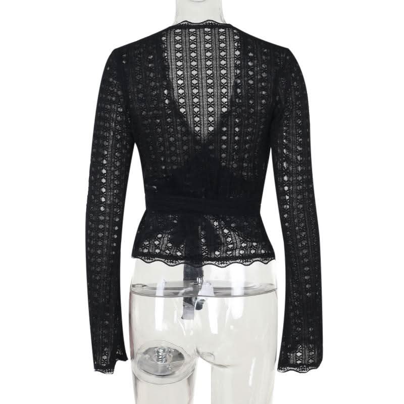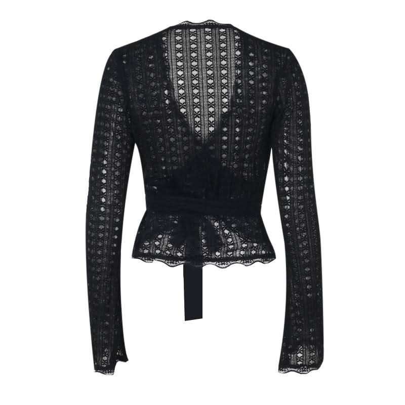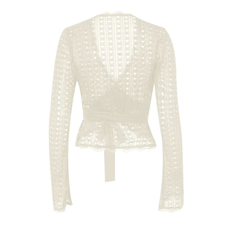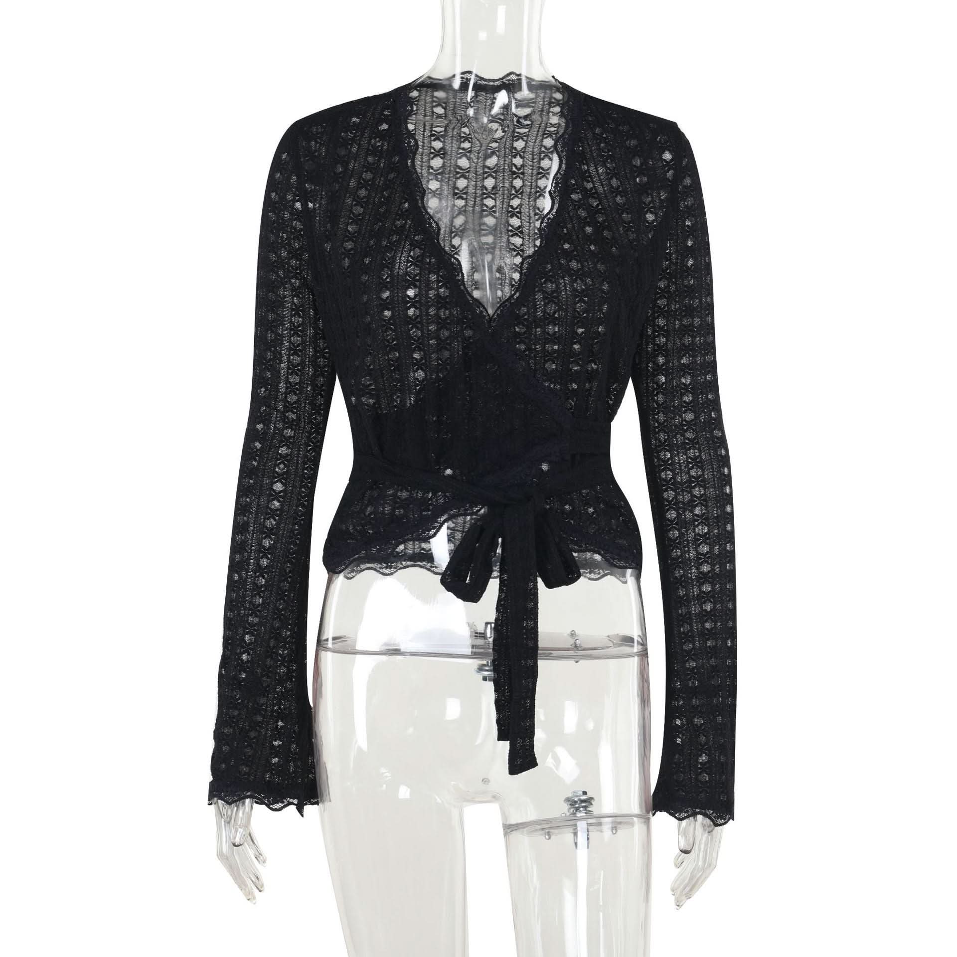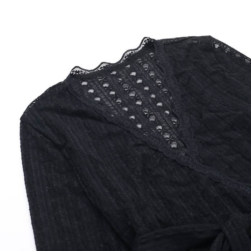Long flared sleeve v neck lace hem knotted top