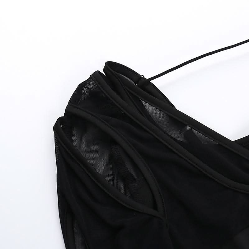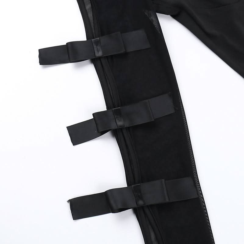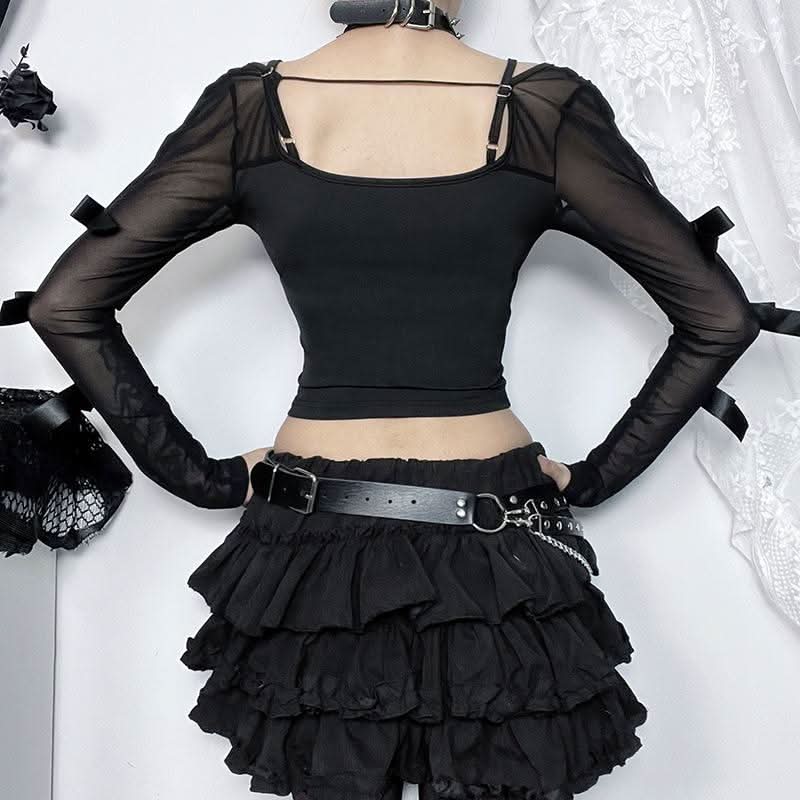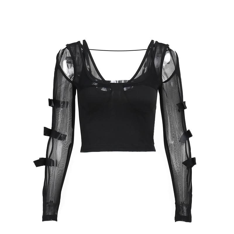 Long sleeve bowknot mesh v neck hollow out cut out top