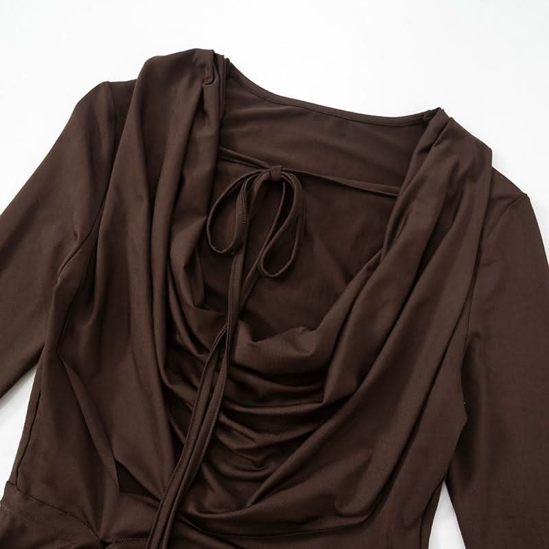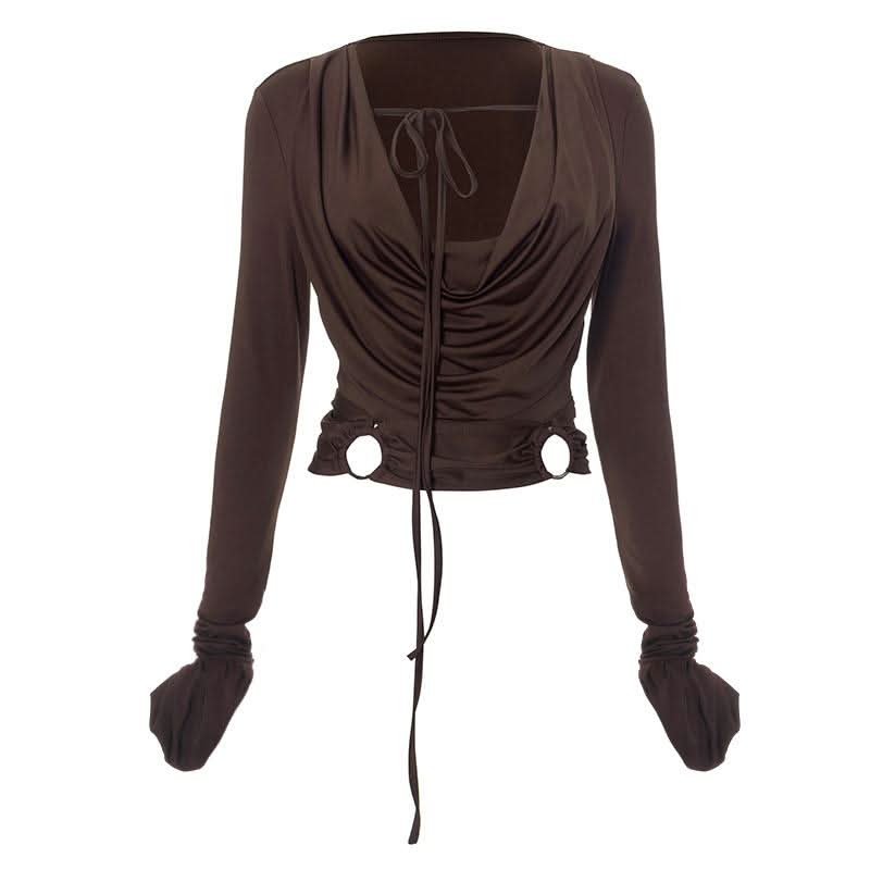 Long sleeve cowl neck o ring self tie ruched hollow out cut out top