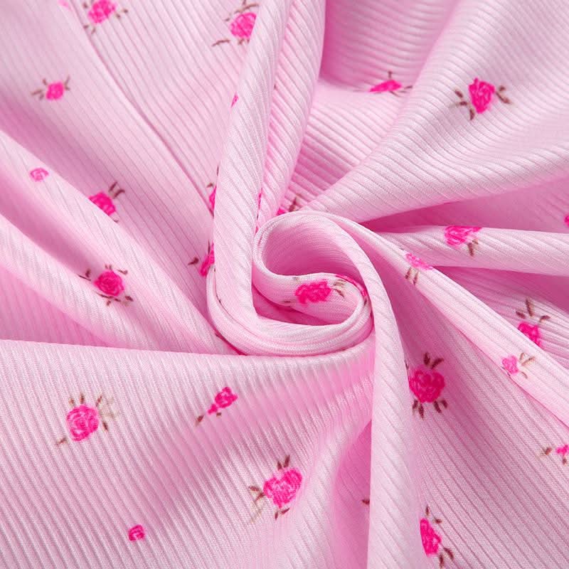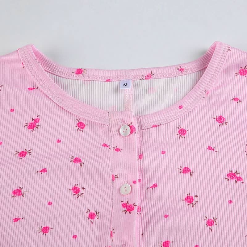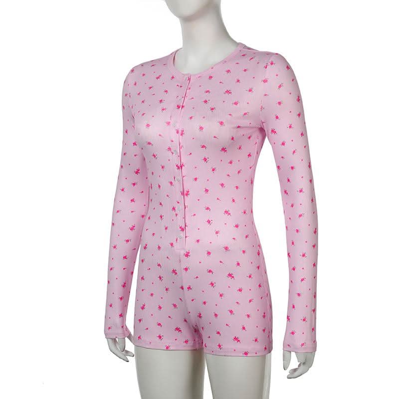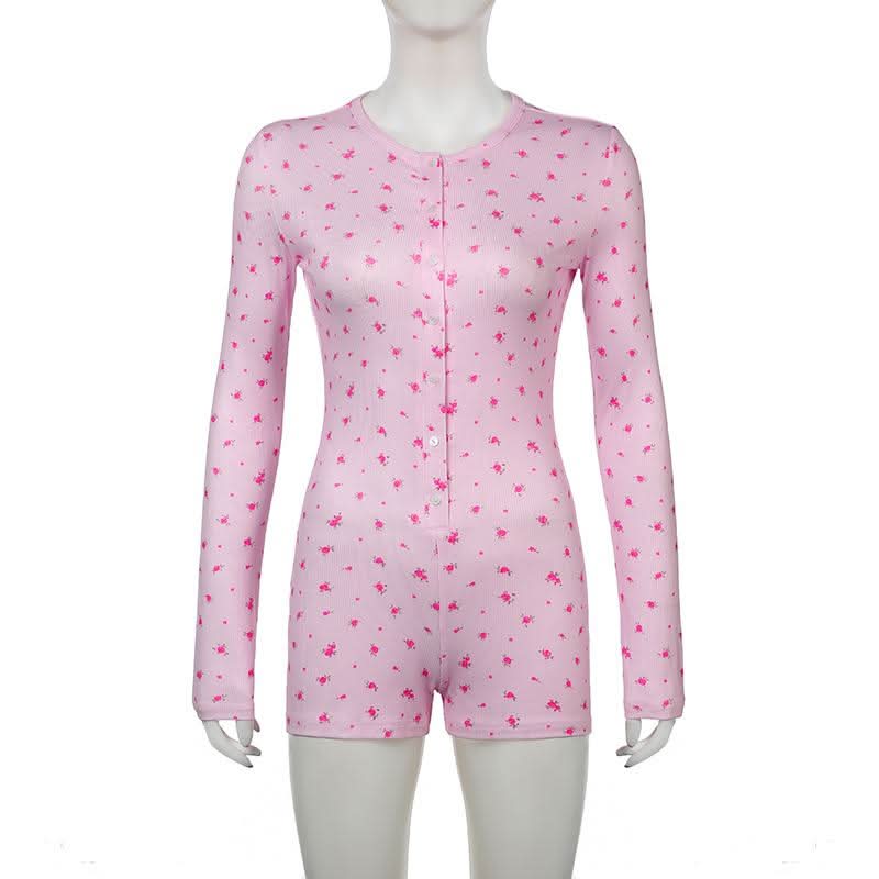 Long sleeve crewneck button flower print romper