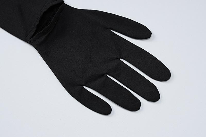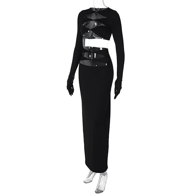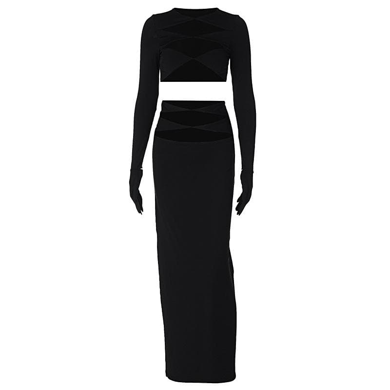 Long sleeve crewneck gloves hollow out solid maxi skirt set