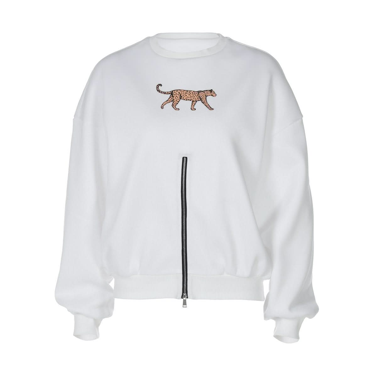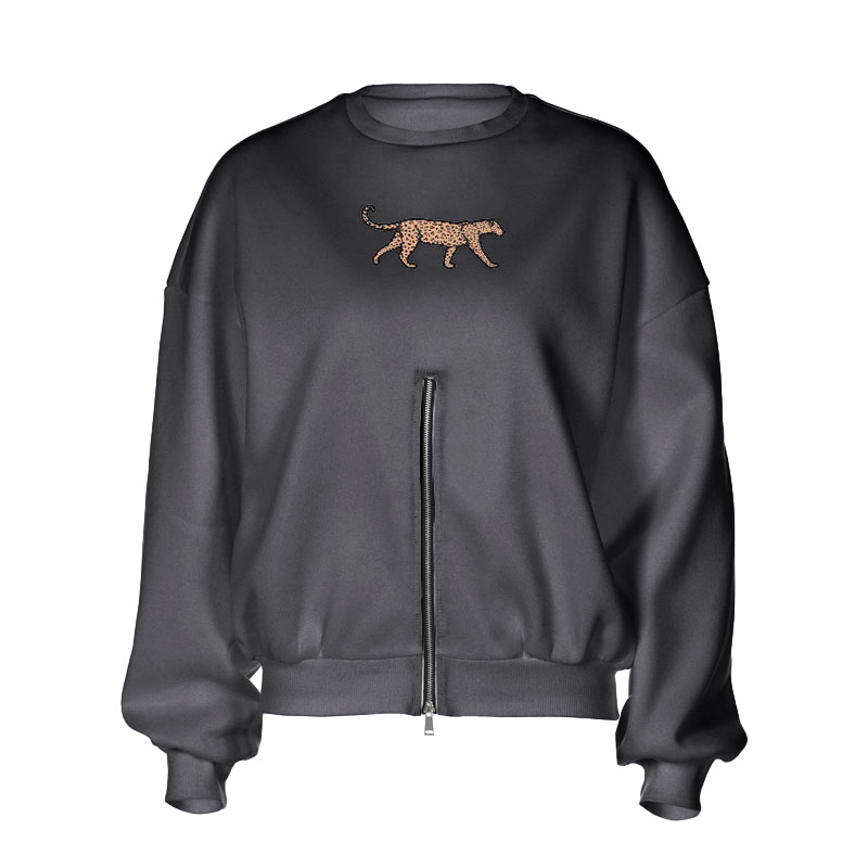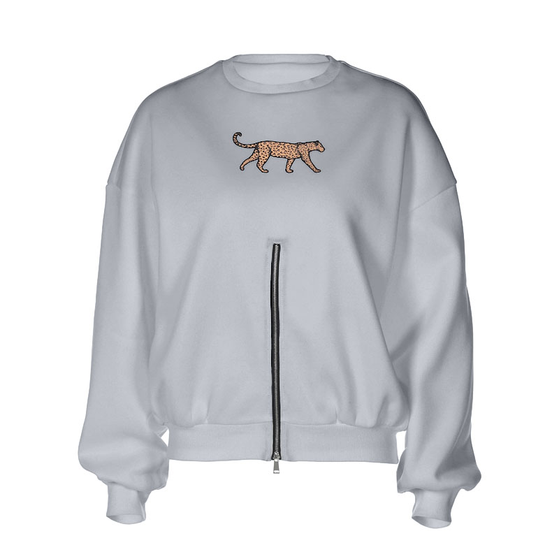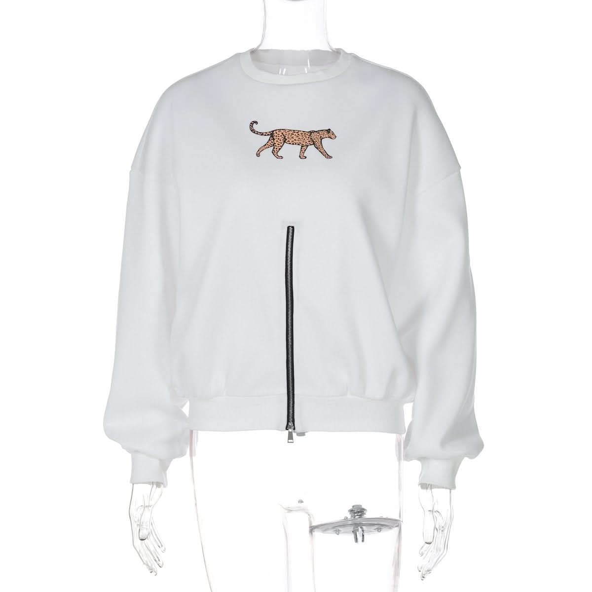 Long sleeve crewneck leopard pattern zip-up top