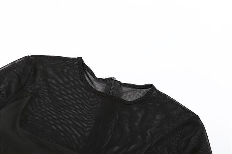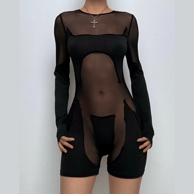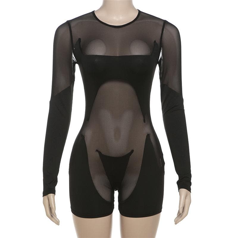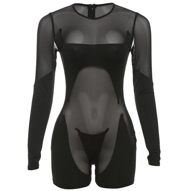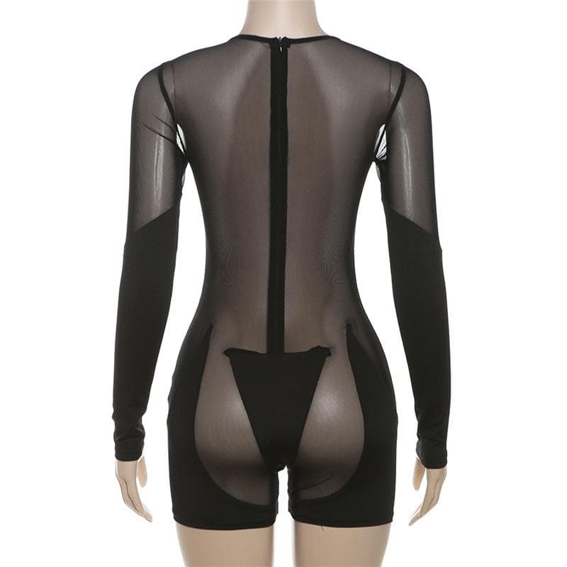 Long sleeve crewneck mesh patchwork zip-up romper
