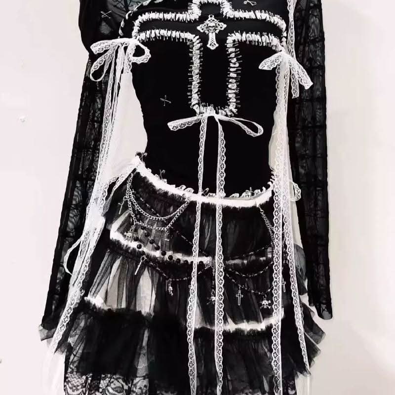 Long sleeve lace hem mesh cross pattern mini skirt set