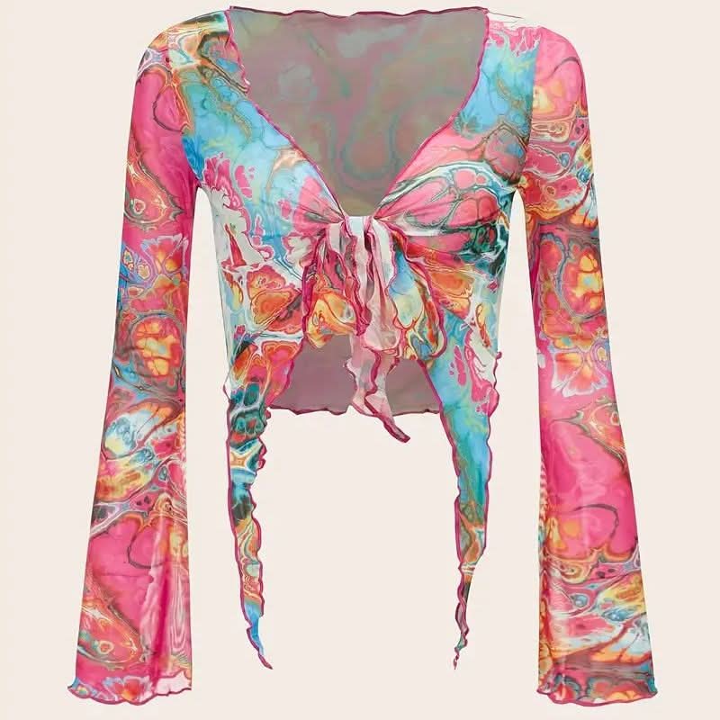 Long sleeve mesh contrast knotted ruffle top
