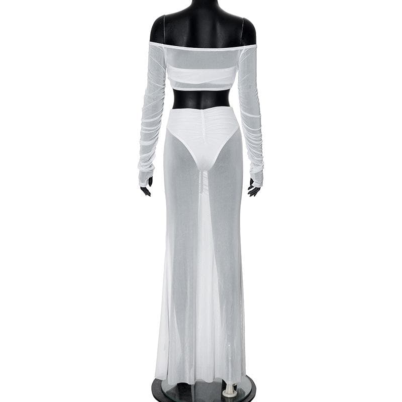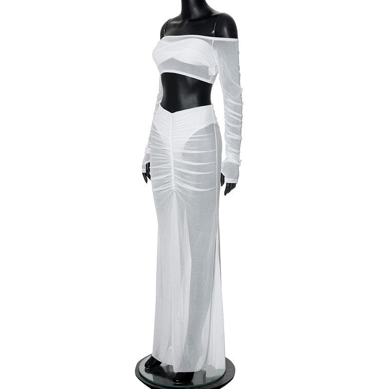 Long sleeve off shoulder ruched mesh maxi skirt set