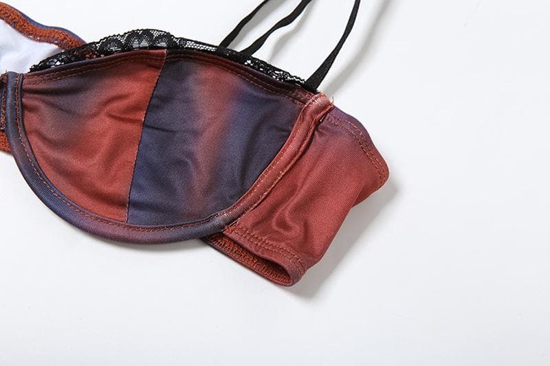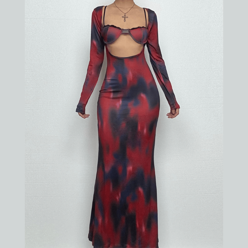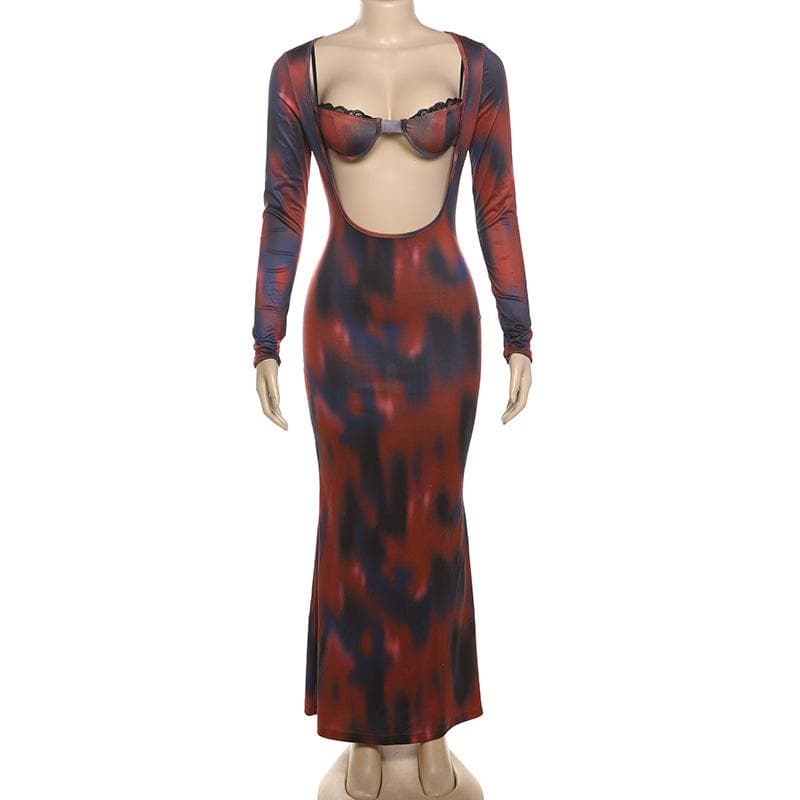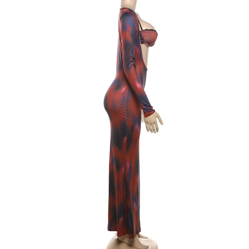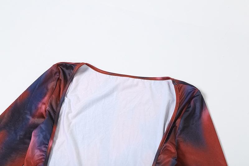 Long sleeve print v neck lace hem contrast maxi skirt set