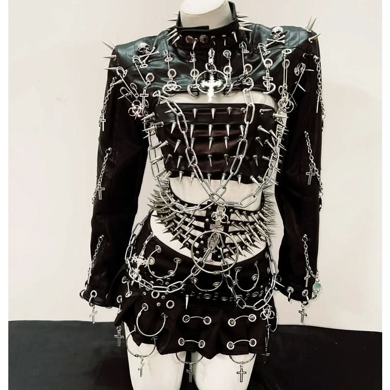 Long sleeve rivet PU leather o ring metal chain belt top