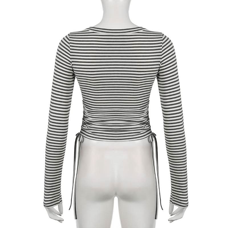 Long sleeve round neck striped drawstring top