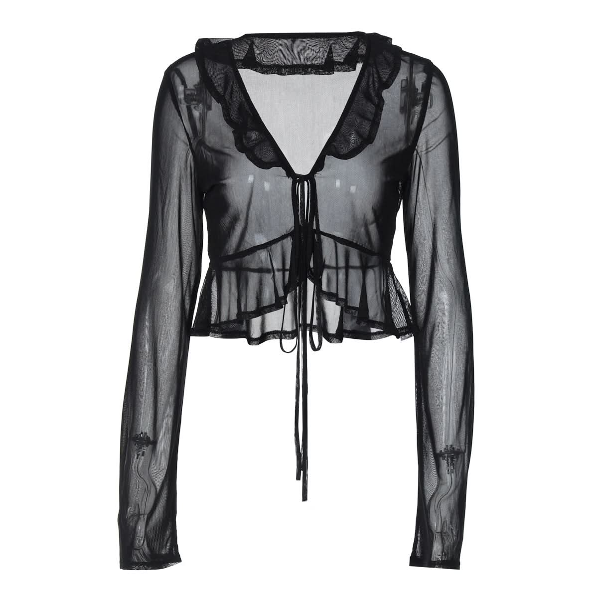 Long sleeve sheer mesh ruffle self tie top