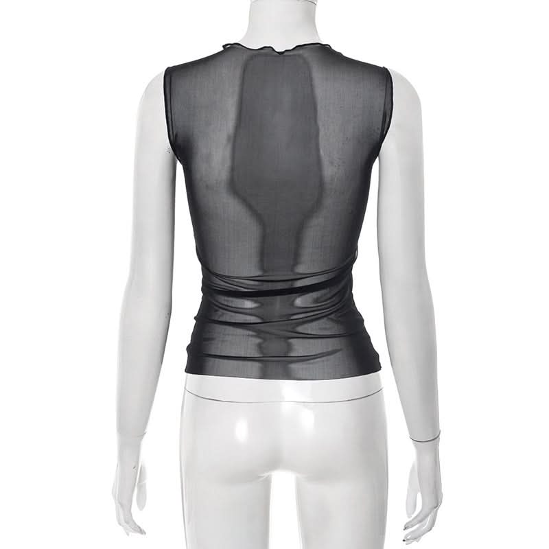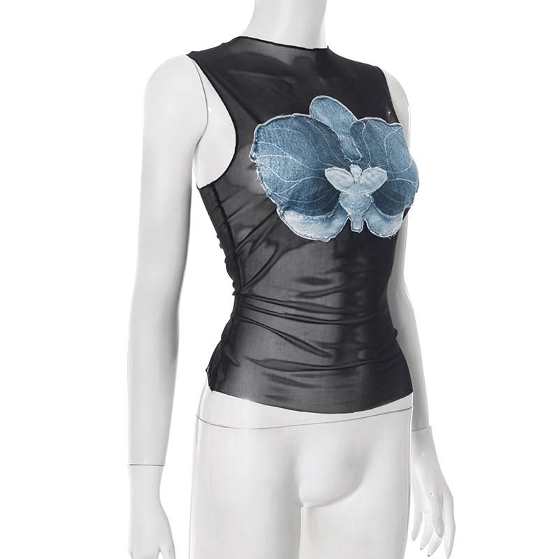 Mesh ruffle flower pattern crewneck top