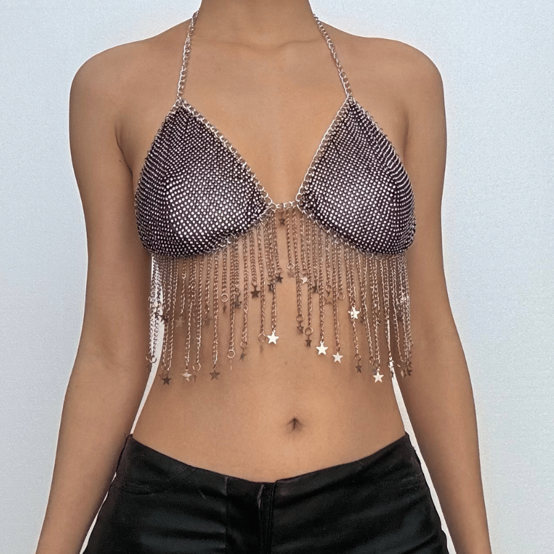 Metal chain halter beaded v neck tassels top
